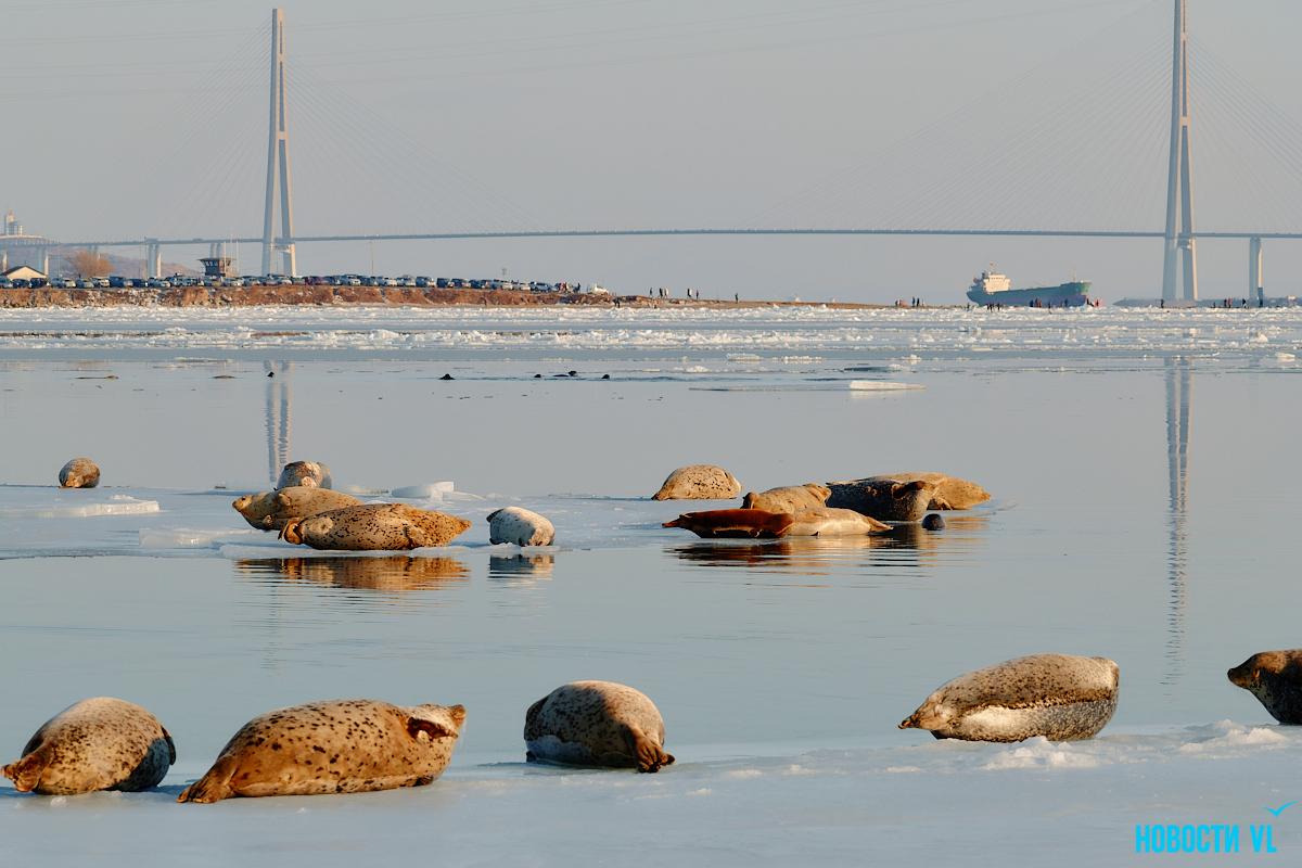 В воскресенье, 4 января, фотограф Новостей VL обнаружил у Токаревского маяка множество отдыхающих на льду ларг. Взрослые нерпы вместе детёнышами расположились на ледовом поле вдоль береговой линии. У каждой ларги здесь своё место – чем выше её авторитет животного, тем ближе она находится к воде. Нерпы скользят по льдинам и вальяжно греются под лучами зимнего солнца.