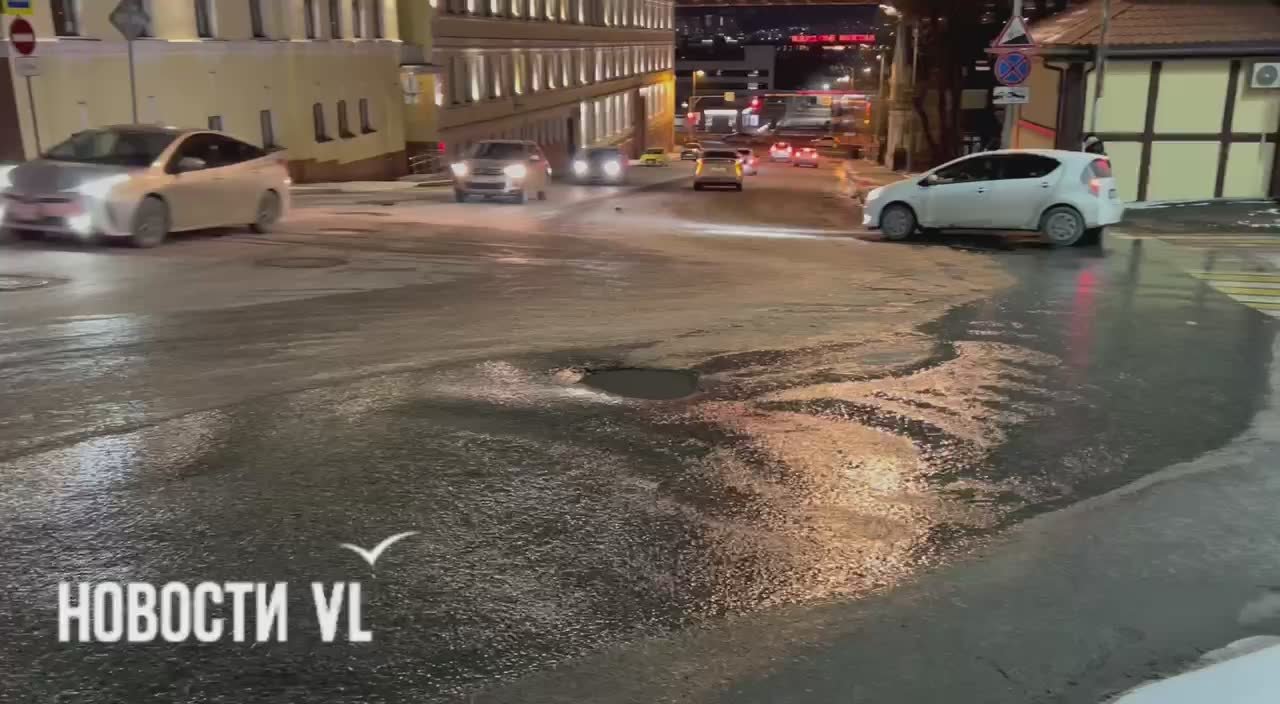 На перекрестке 1-й Морской и Посьетской прорвало канализацию. Она бьёт фонтаном из люка и стекает к железнодорожному вокзалу, заливая часть дороги и тротуар. Последний уже покрылся подмерзающей грязной жидкостью и стал скользким.