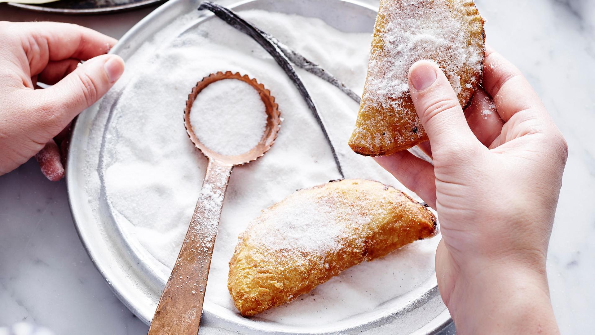 Замешанному тесту перед готовкой нужно настояться в холодильнике 20 минут. Затем сформировать небольшие шарики, добавить внутрь начинку и скрепить края мукой.