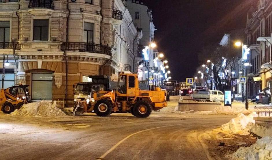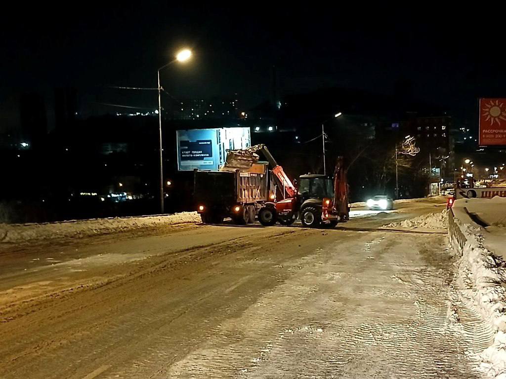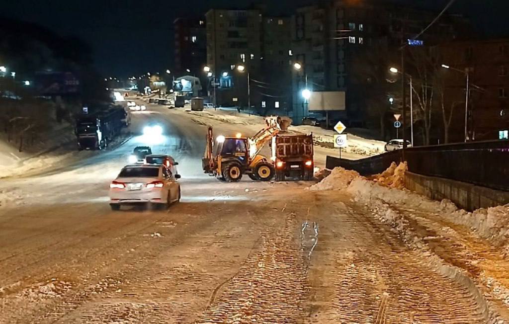 Вывоз собранного снега, расчистка межквартальных проездов и повторные обработки сложных участков реагентами проводятся во Владивостоке в круглосуточном режиме.