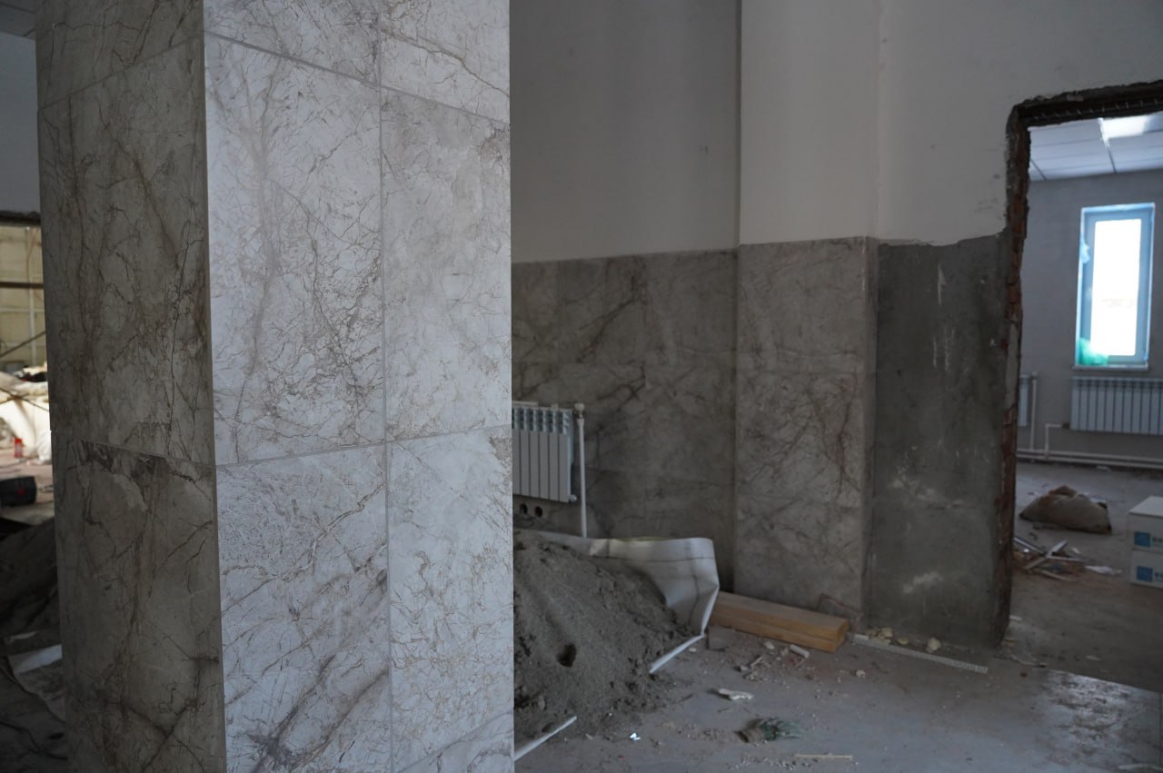 На текущий момент строительная бригада завершила ряд ключевых внутренних работ: выполнена отделка потолков на двух этажах, уложен кафель на колоннах, панелях и лестничных маршах, проведена электропроводка, смонтирована система видеонаблюдения и противопожарная система.