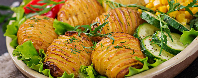 Вставить картошку в духовку, полить растопленным сливочным маслом и запекать в течение 35-40 минут. Пока картофель готовится, салат можно разобрать на листья и выложить их на блюдо. Когда картофель станет золотистым и хрустящим, его следует перейти к сервировке: аккуратно разместите картофельный веер на салатных листьях, а вокруг них разложите зерна кукурузы, нарезанные дольками помидоры и огурцы. Для завершающего акцента можно украсить блюдо свежей зеленью, особенно рекомендуется использовать базилик.