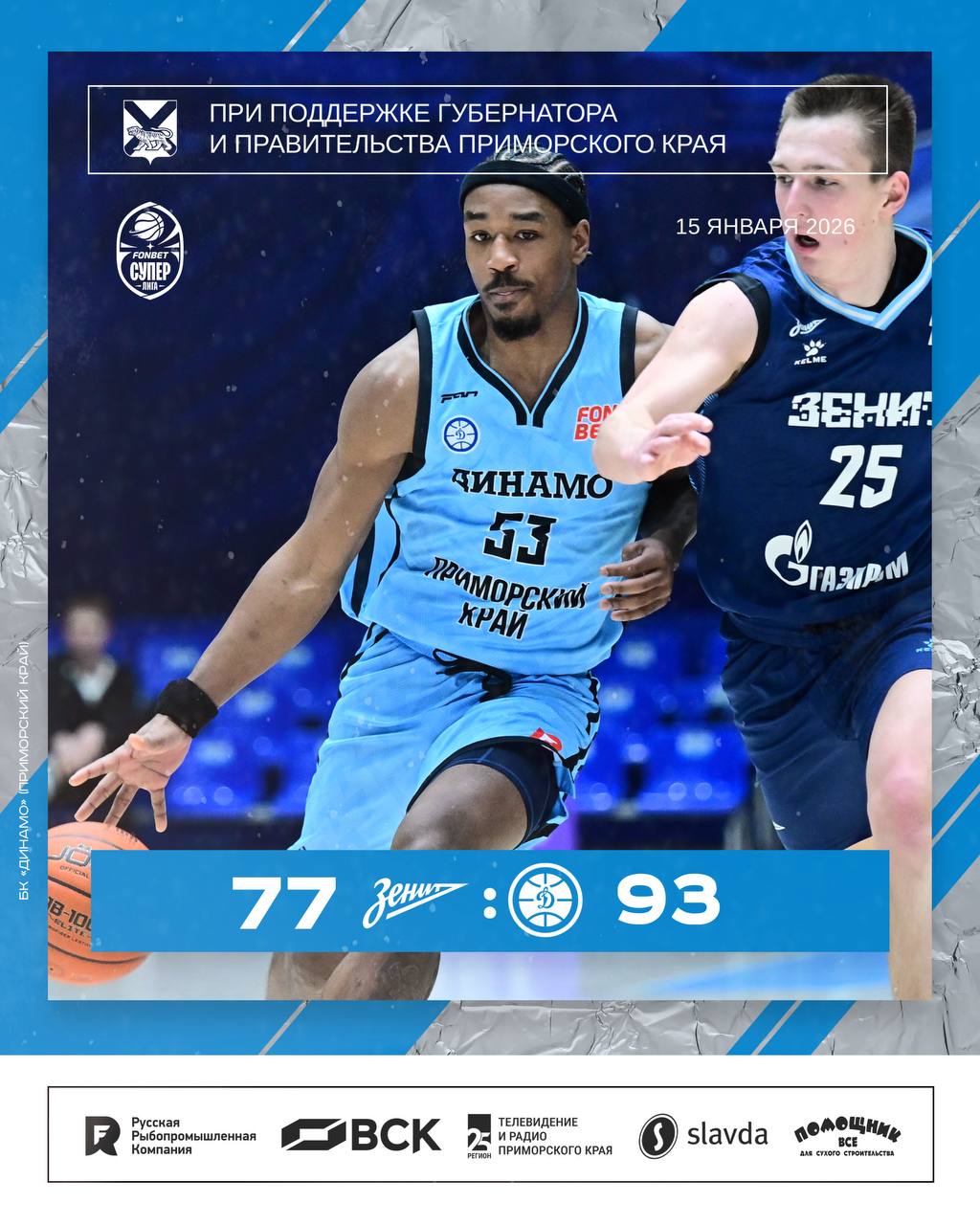 Третью 10-минутку обе команды начали решительно – проходами обменялись Ершов и Кривых, далее залетел «трюльник» от Прокопенко. «Зенит» старался держать «динамовцев» на короткой дистанции, но на помощь пришли сверхдальняя «треха» Аксенова, броски Захарова из «краски» и сумасшедшие залпы Смита, который старался побить свой же рекорд трехдневной давности, – 67:60. В решающей четверти «динамовцы» хорошо защищались, великолепно двигали мяч и находили моменты для открытых бросков – в итоге набрали еще 26 очков в копилку, а точку поставил Ершов трехочковым из-за дуги. Победа – 93:77!