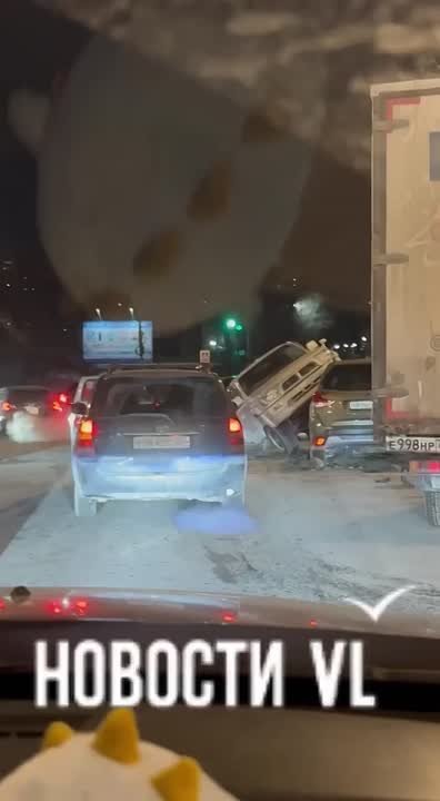 Перед жд-переездом на Луговой произошло ДТП и собралась пробка. Toyota Hilux Surf налетел на Subaru Forester и повис у него на капоте. Повреждения получили и другие машины, которые ехали рядом.
