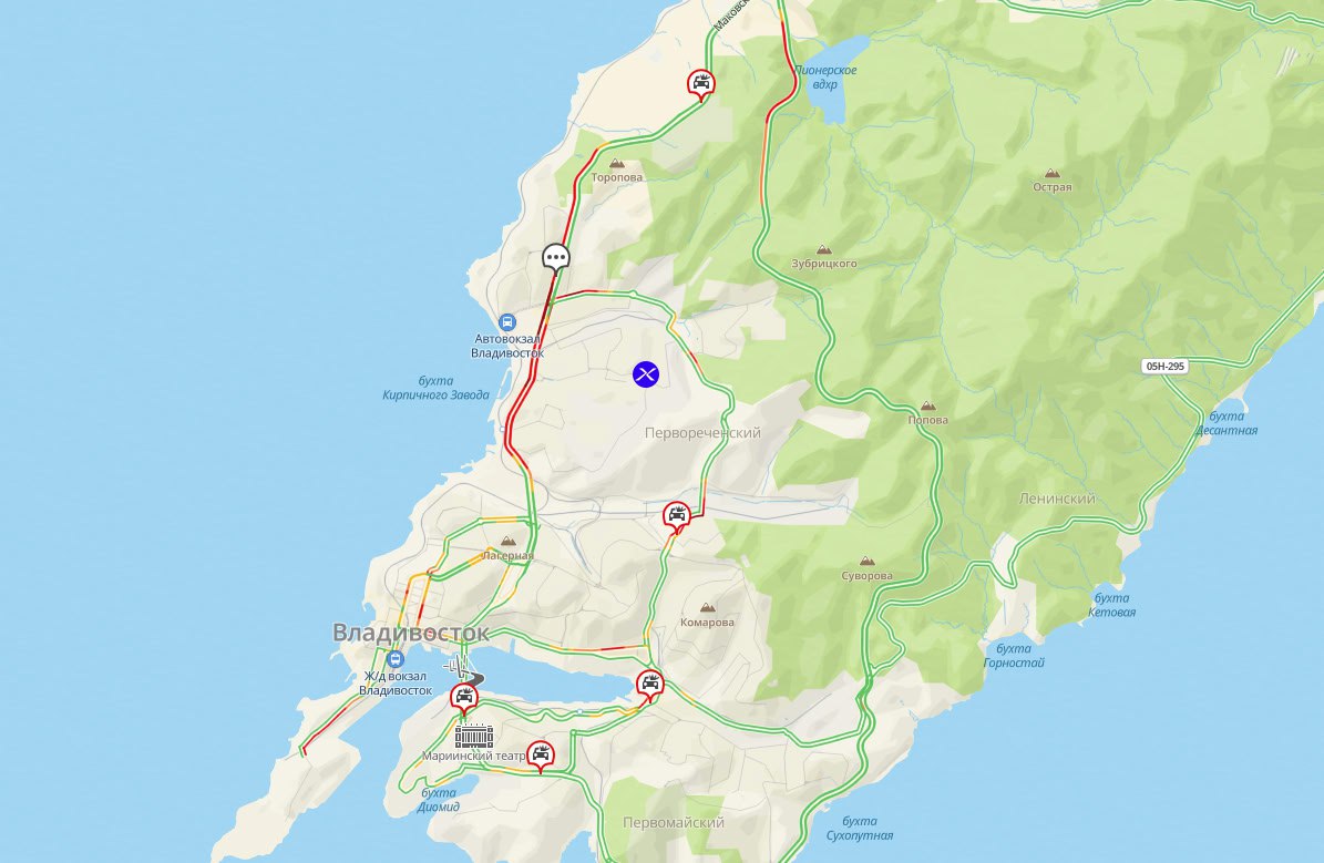 Ситуация на дорогах по сравнению с прошлой неделей значительно улучшилась. Сейчас пробки оцениваются в 5 баллов. Основ затор от Второй Речки до Некрасовской и обратно.