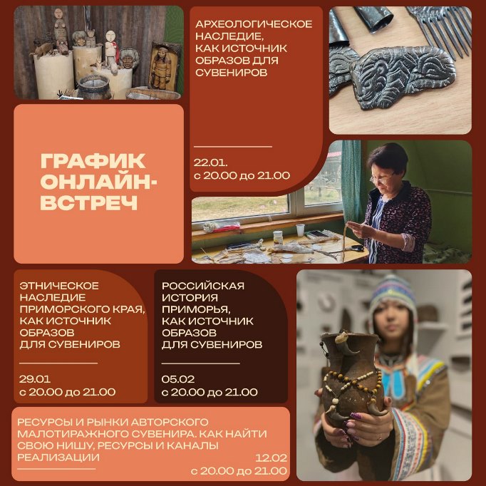 Эксперты — историки, этнографы и опытные мастера — раскроют темы археологического, этнического и исторического наследия региона как источника для создания сувениров, а также расскажут о ресурсах и рынках сбыта. После каждого вебинара в Telegram-канале проекта будут организованы консультации. Для участия в вебинарах и конкурсе необходима регистрация по ссылкам: