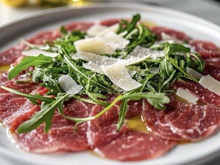 3. Главное событие: Слегка подмороженную говяжью вырезку нарезать максимально тонкими ломтиками. Их можно красиво свернуть в форме розочек или просто уложить на подушку из рукколы. Каждый кусочек мяса добавит блюду утончённости и элегантности.