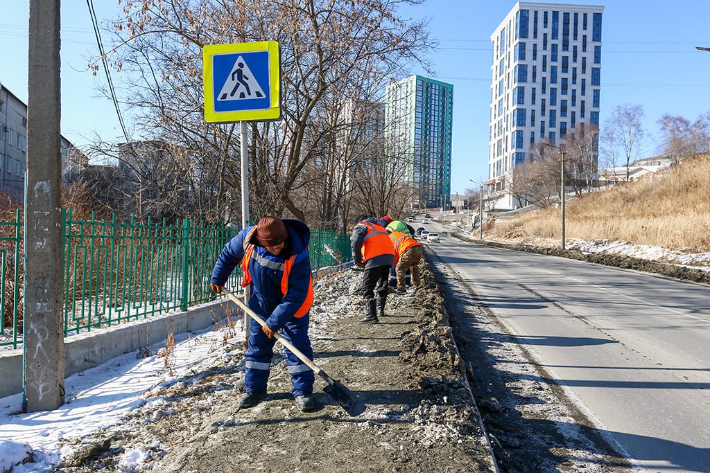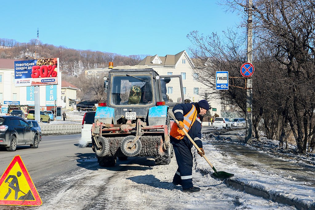 Сегодня на участке от остановки «Ленинская» до «Тихоокеанской» работает специализированная бригада, в составе которой три единицы техники. Трактор используется не только для подбора снега, но и, при необходимости, для разрушения плотного наста и наледи. Основная же задача звена — уборка, погрузка и вывоз наледи.