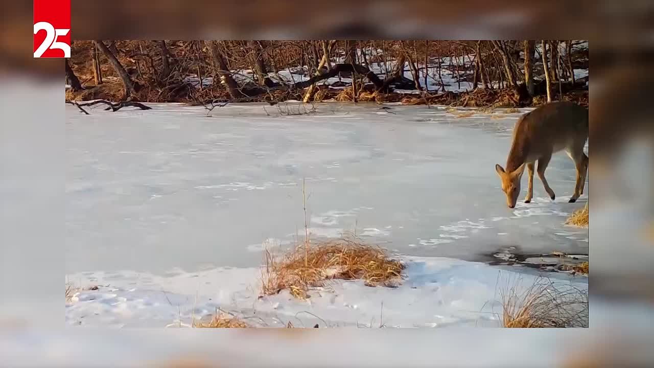 Когда водоём замёрз, а пить хочется — всегда есть возможность просто полизать лёд. Именно так пятнистые олени из «Земли леопарда» утоляют свою жажду.
