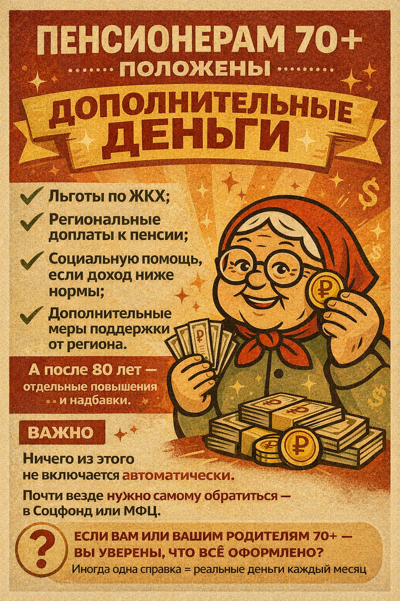 Во многих регионах предусмотрены дополнительные выплаты для пенсионеров старше 70 лет, которые могут включать: