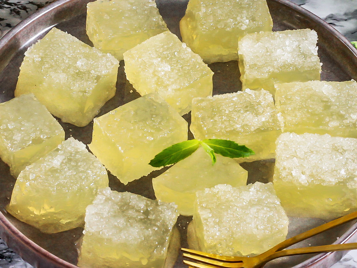 После застывания выньте мармелад: на несколько секунд поставьте форму в горячую воду, затем аккуратно переверните его на доску и нарежьте кубиками. Вы можете обвалять кусочки в сахаре или использовать кондитерские посыпки для украшения, но это не обязательно — десерт прекрасно держит форму и без лишнего декора.