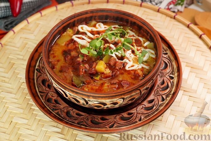 - Венгерский картофельный суп с копчёностями: это сытное блюдо готовится быстрее и насыщеннее благодаря ароматным копчёностям. Кремовая консистенция заправки из сметаны делает его уникальным, а паприка придаёт блюду красивый цвет и неповторимый вкус.