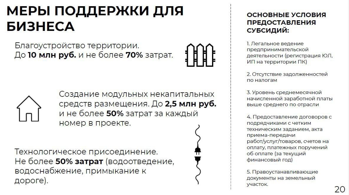 Для бизнеса предусмотрены меры господдержки — субсидии на благоустройство, установку инфраструктуры, некапитальные объекты размещения и техническое подключение.