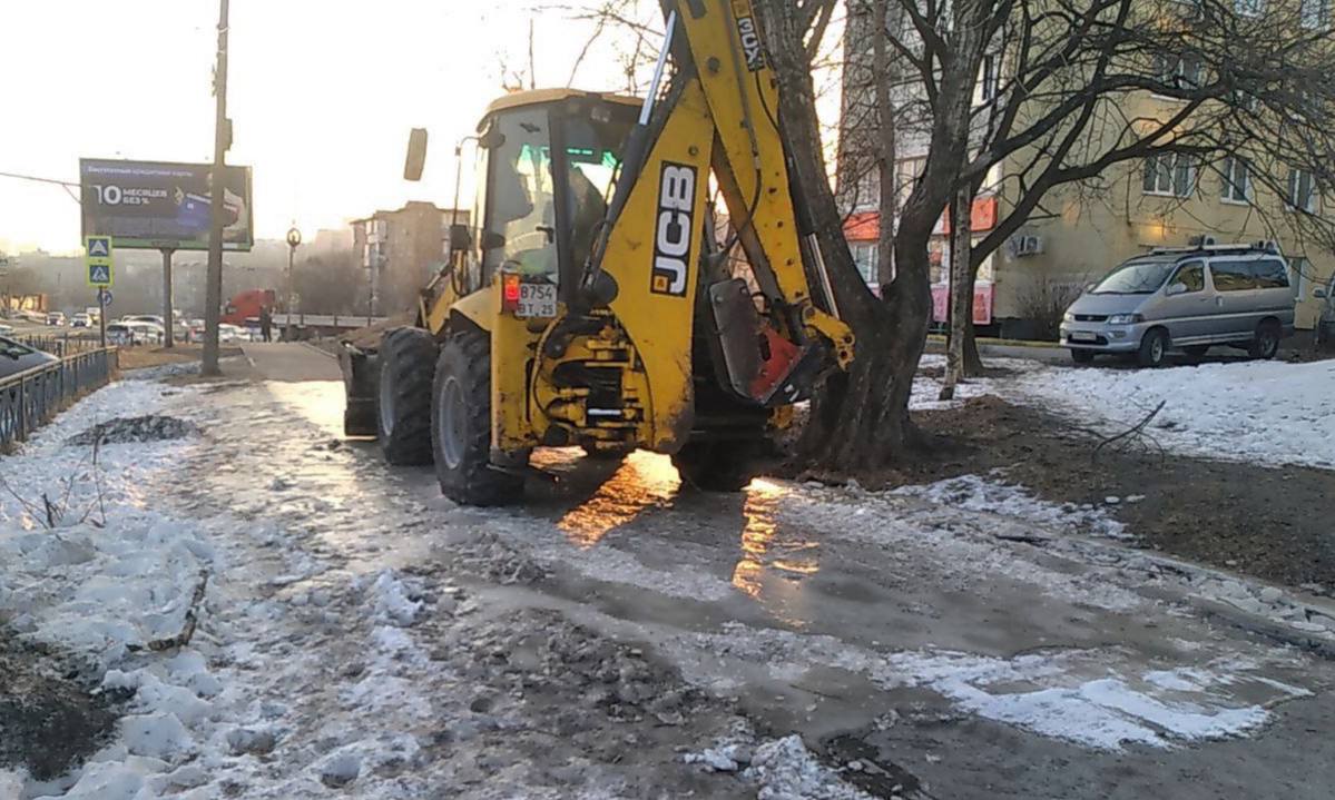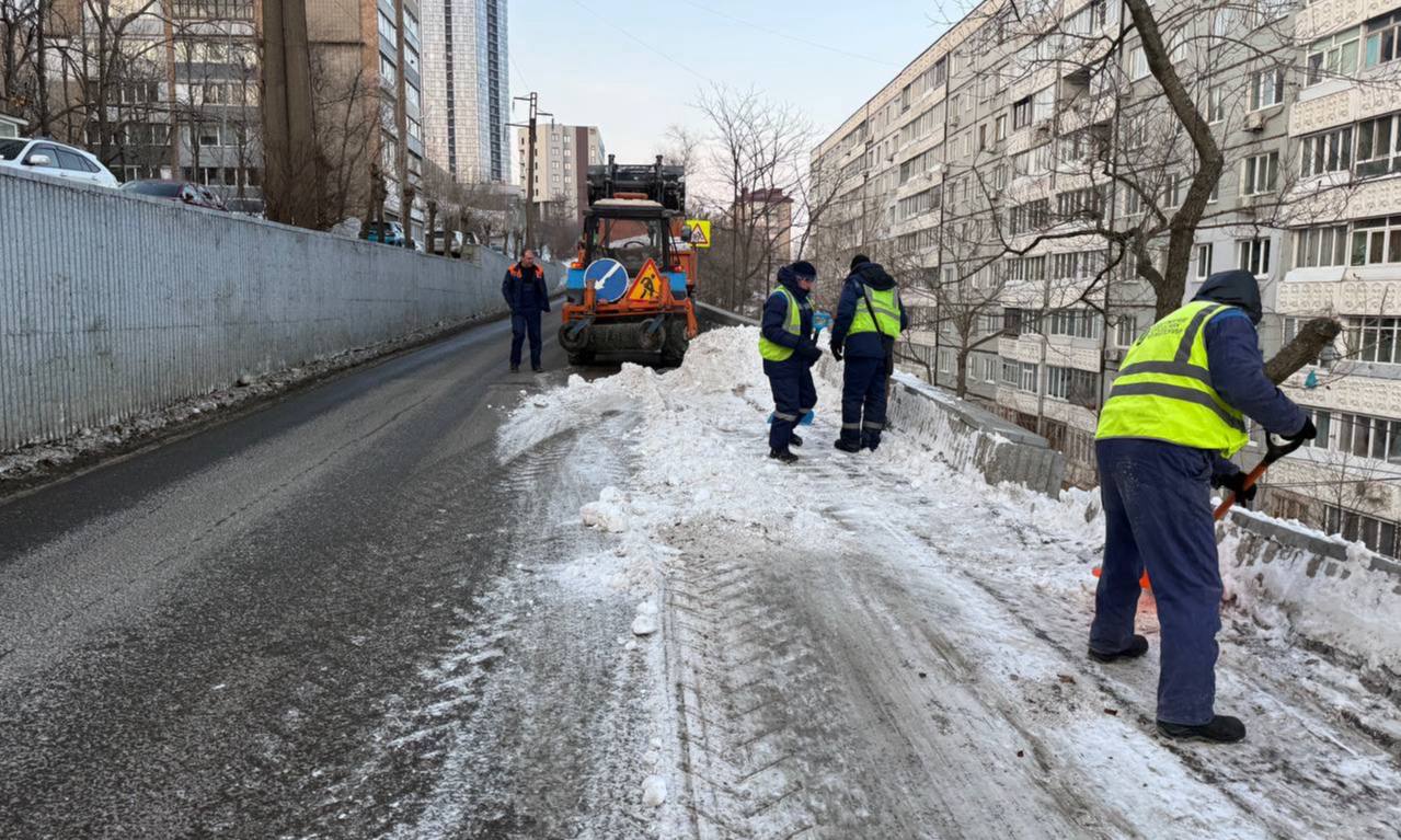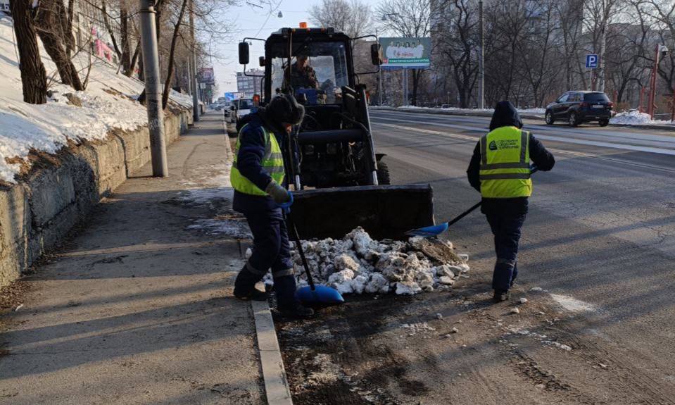Первореченский район — ручная уборка тротуаров от снега на улице Баляева и комплексная уборка снега на проспекте 100-летия Владивостока.