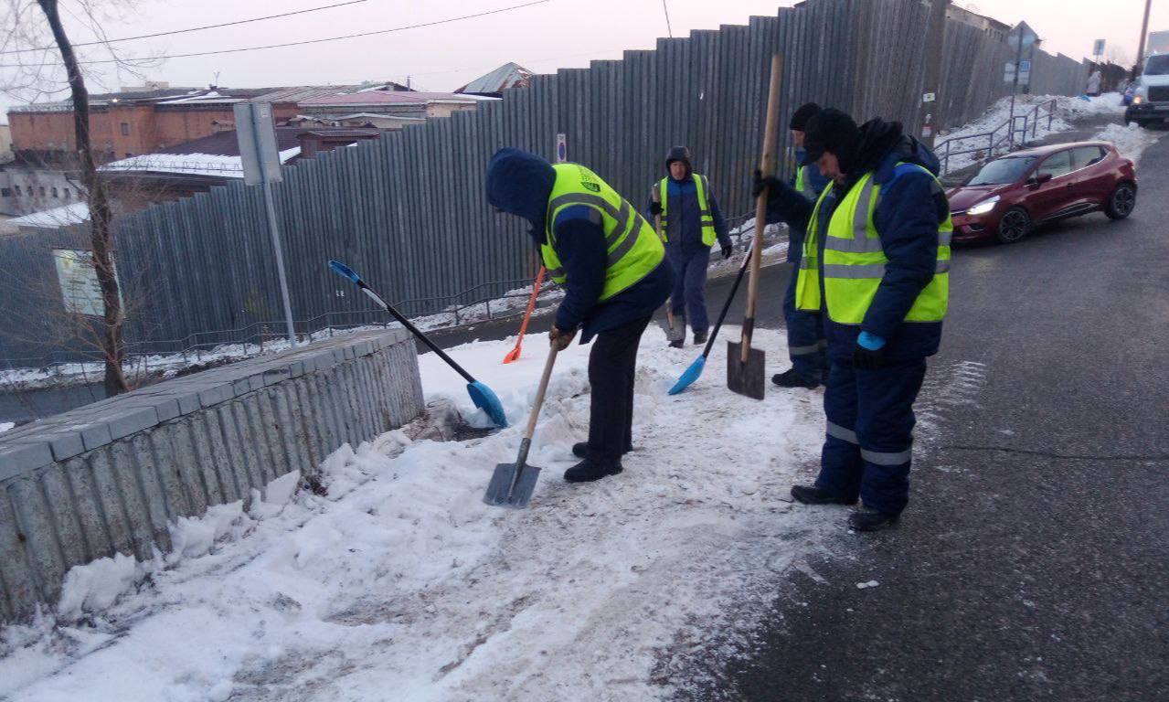 Первомайский район — комплексная уборка на улице Надибаидзе; очистка пешеходных переходов и остановок от снега и льда по району; удаление наледи после течи на улицах Окатовой, 10 и Терешковой, 9.