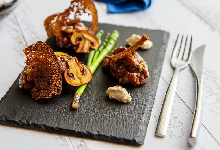Подача превращает привычное блюдо в спокойную сцену трапезы: тартар можно держать в кольце для аккуратной формы, сверху — грибы, обжаренные в сливочном масле, и перепелиный желток, который добавляет нежности. Гарнир из хрена и тонких ржаных гренок напоминает о контрасте и текстурной игре.