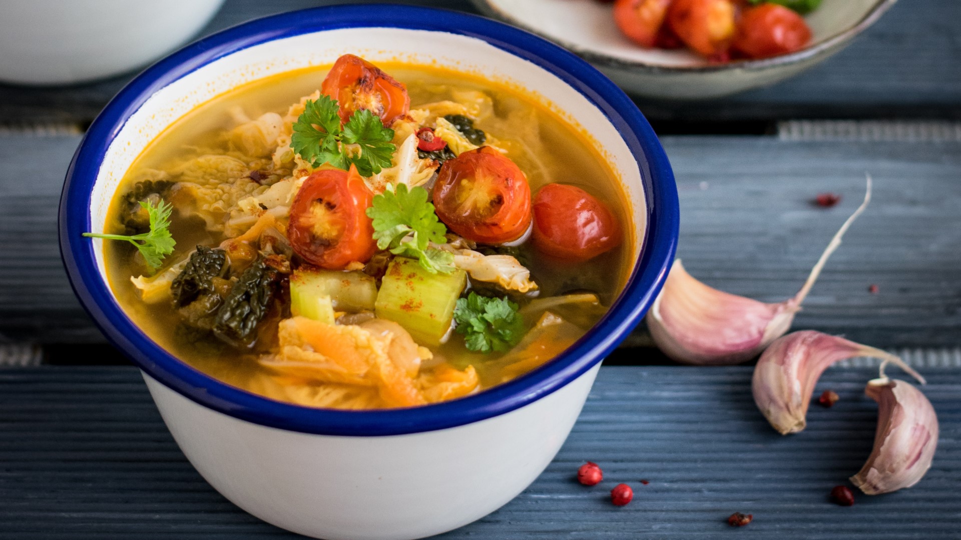 «Для овощного супа нужна правильная основа — бульон. Он варится из лука, моркови и сельдерея. Предварительно их нужно продержать на сухой сковороде до коричневой корочки.