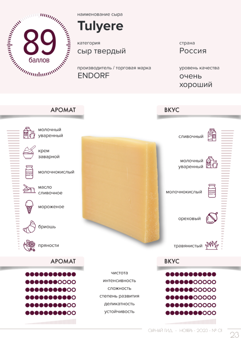 Этот сыр отличается насыщенным вкусом, который находится в идеальном балансе между сладостью и соленостью. Нежное послевкусие с легкой кислинкой и сливочной жирностью дополняется нотами умами. Tulyere отлично подходит как для сочетания с другими сырами, так и для самостоятельного употребления, оставляя приятное впечатление.