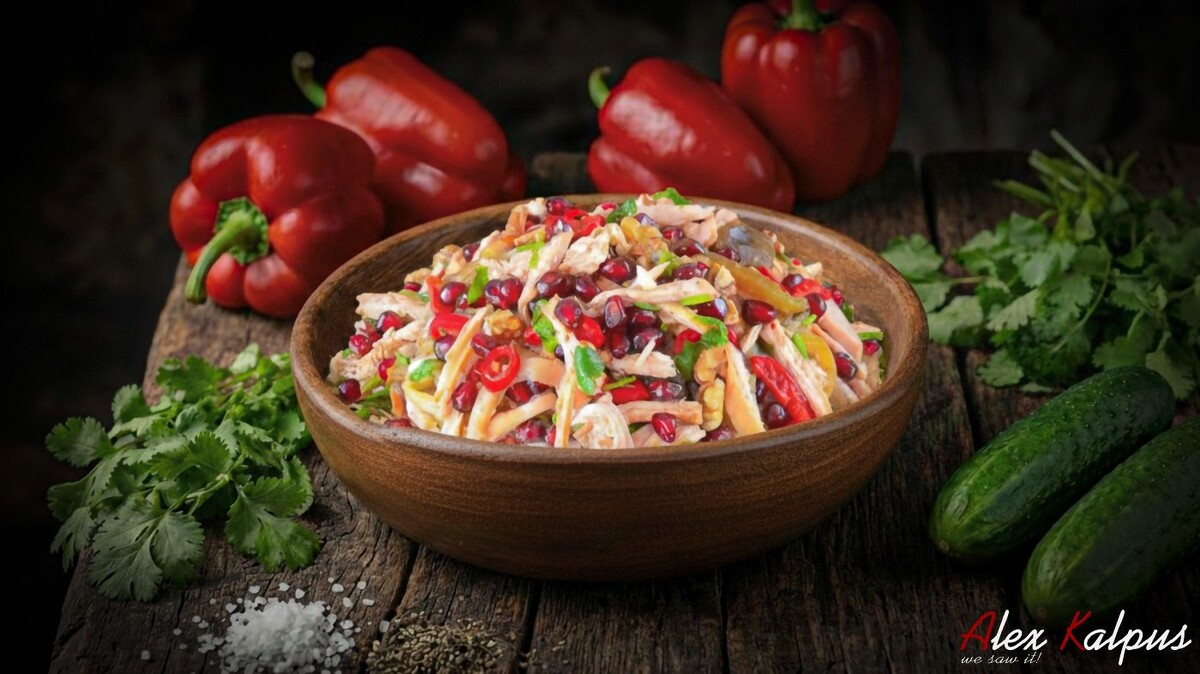 Это сытный и красочный салат, часто подающийся на праздники. Основные ингредиенты: