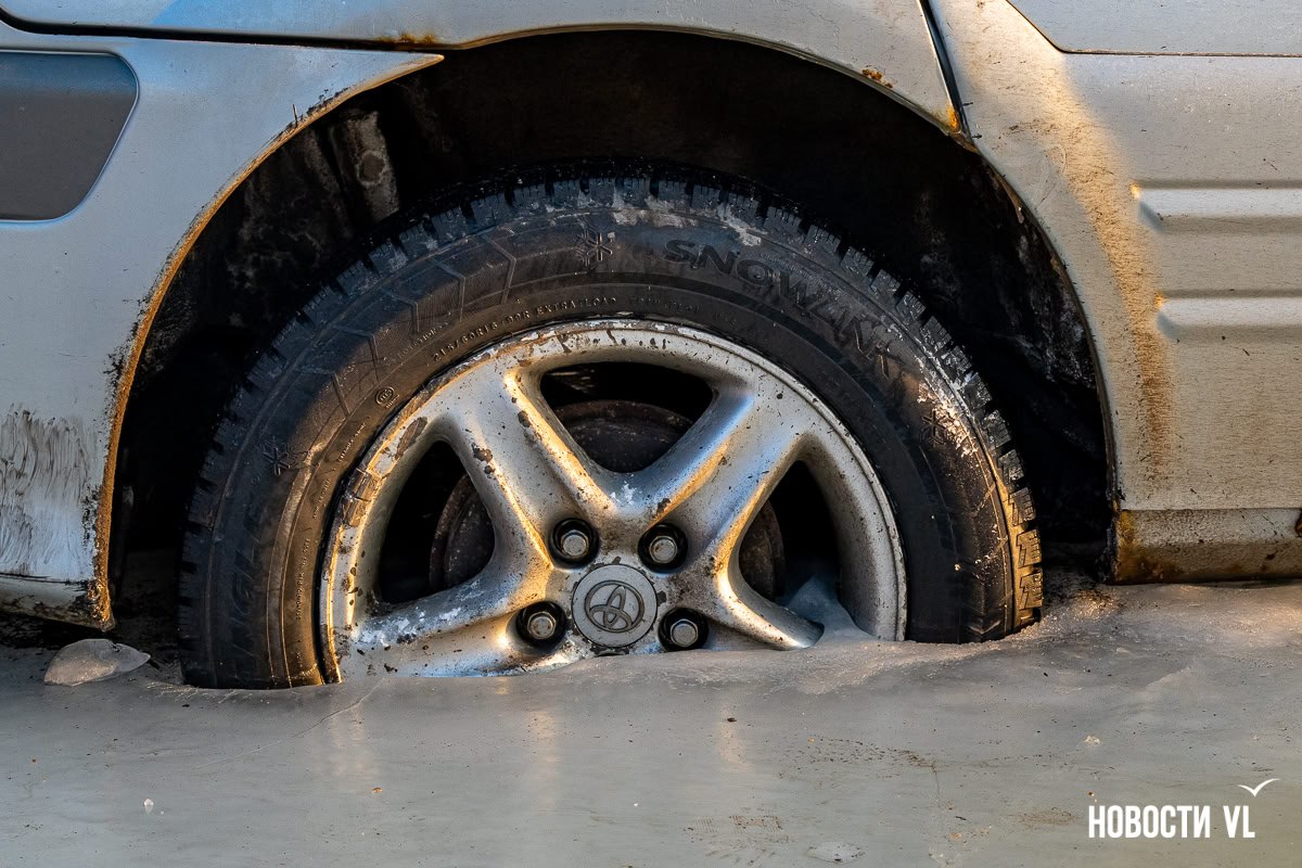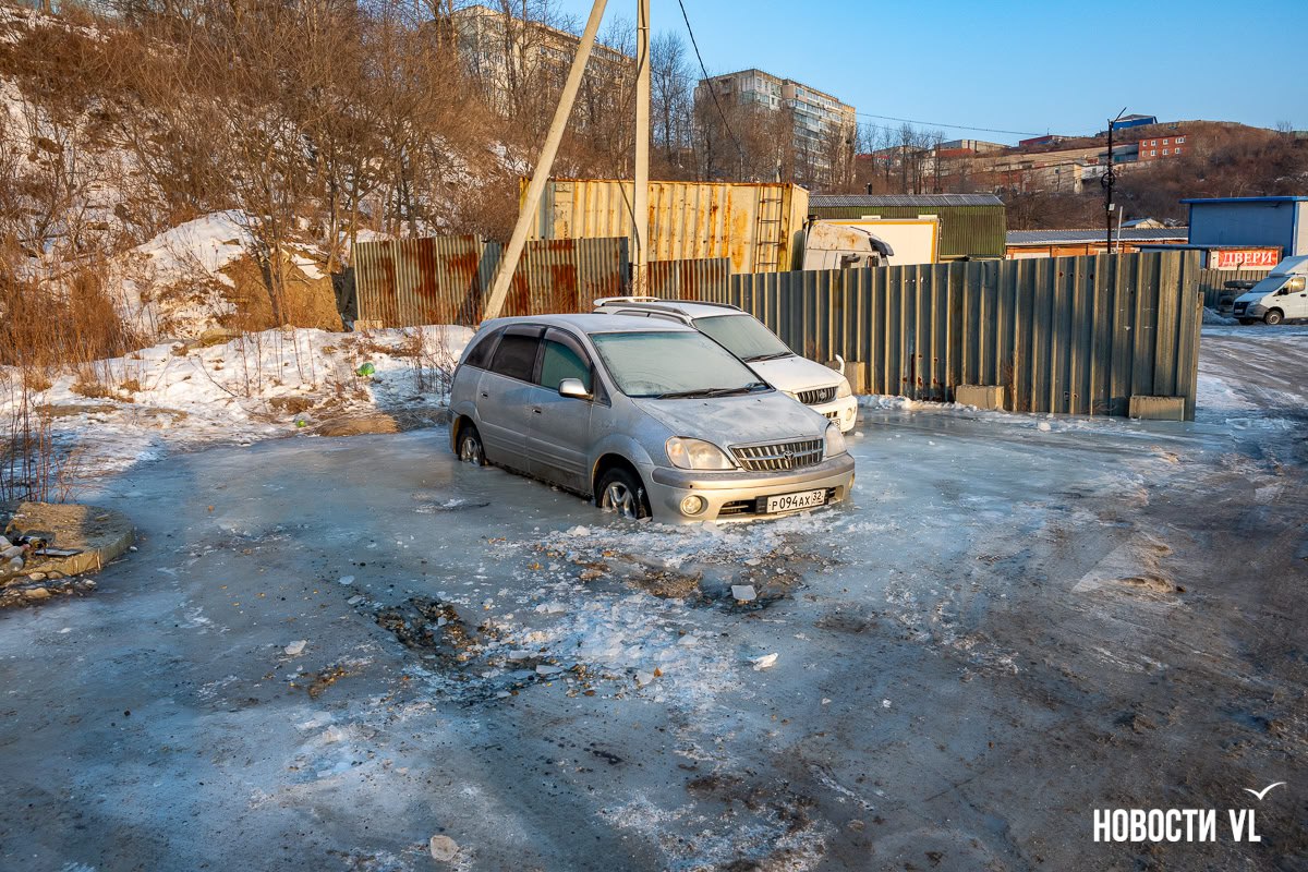 Рядом с домами на Нейбута настоящий ледяной коллапс. Ручей продолжает бежать с косогора, оставленные на парковке машины всё глубже погружаются в лёд. По вечерам водители вытягивают вмёрзшие автомобили. Дорогу присыпали песком, но источник не иссякает его причину уже ищут.