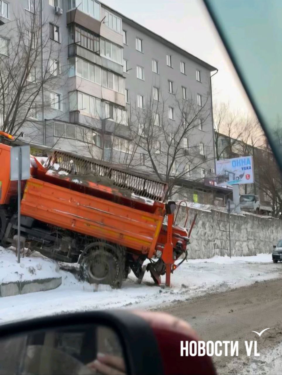 Угол наклонам там довольно большой, вероятно из-за этого посыпальный механизм загнулся, когда спецмашина сдала назад. На некоторое время проезд оказался заблокирован. Местные жители говорят, что это единственный нормальный заезд к домам....