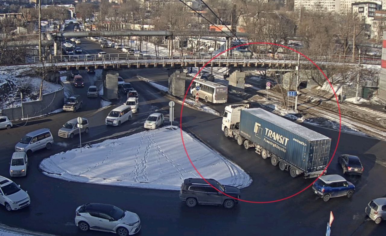 В районе Спортивной на полосе в строну Луговой произошло ДТП с участием автобуса 4 и большегруза