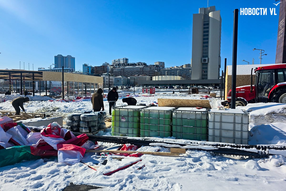 Во Владивостоке во время разборки катка на центральной площади пролился антифриз. Его использовали в холодильном оборудовании, которое поддерживало температуру льда. Фонтан, который находится рядом, не пострадал. А весь зелёный снег соберут и вывезут.