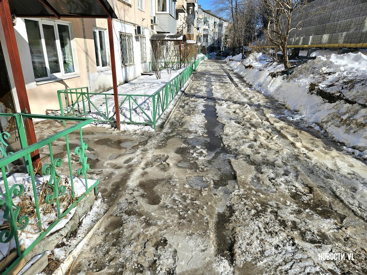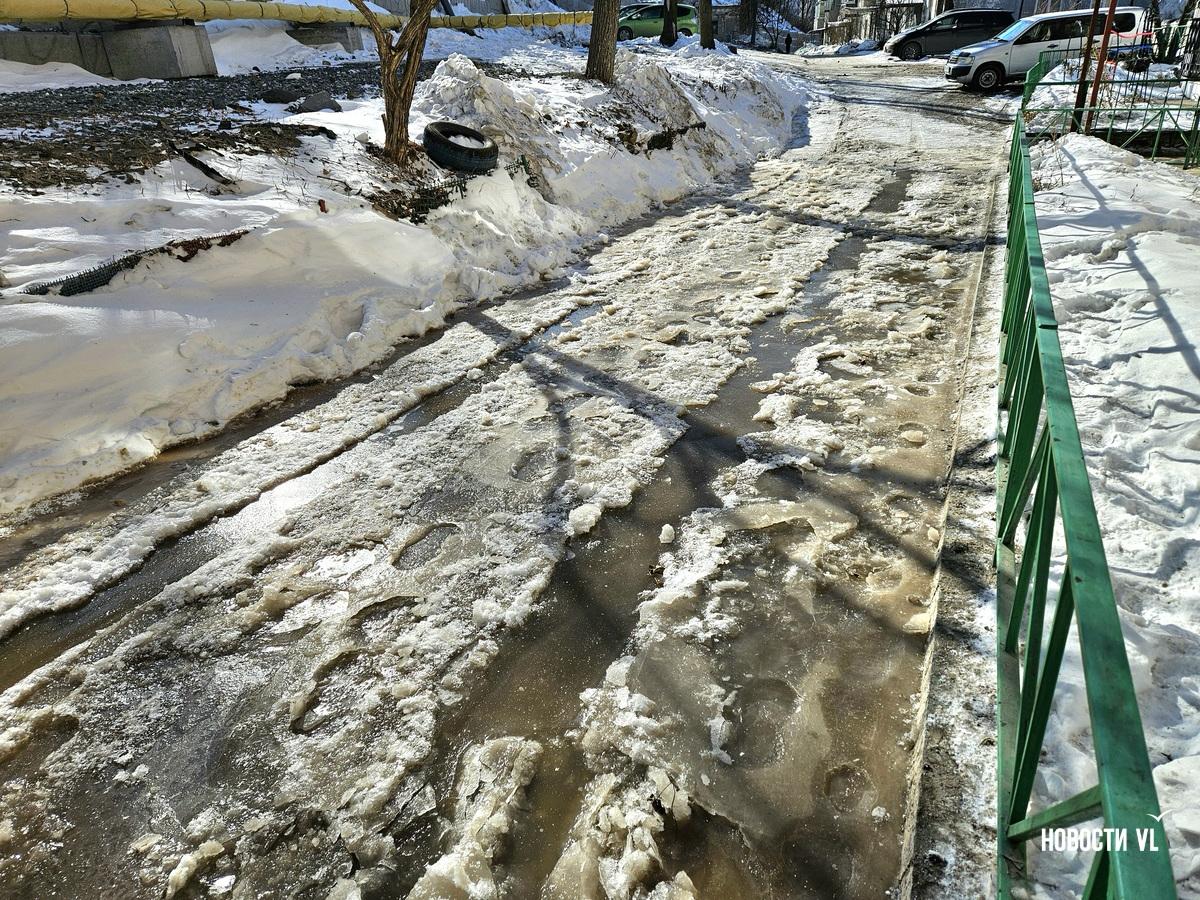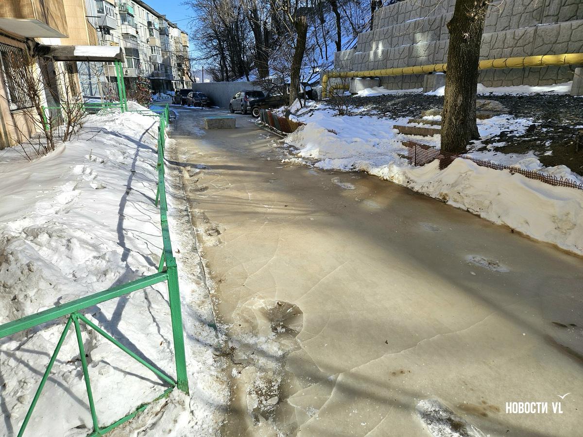 У дома № 58 на Луговой во Владивостоке из-за засора канализации весь двор залило нечистотами. У некоторых подъездов жидкость подобралась вплотную ко входным дверям. Проезд затянут тонкой коркой льда – двигаться здесь невозможно, поэтому он перегорожен бетонными блоками.