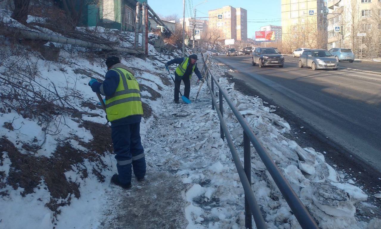 Первореченский район комплексная уборка прибордюрной полосы на улицах Некрасовской и Народном проспекте, уборка тротуаров от снега на улице Баляева.