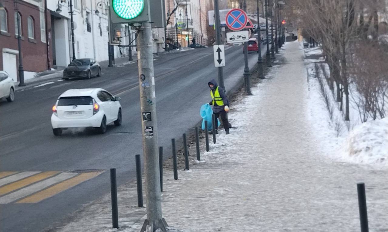 Первомайский район уборка прибордюрной полосы и тротуаров на улице Дубовой, сбор случайного мусора на трассе Седанка Патрокл.
