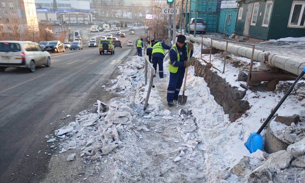 Ленинский район ручная просыпка тротуаров по району, уборка снега на улицах Светланской и Капитана Шефнера, удаление несанкционированной рекламы.