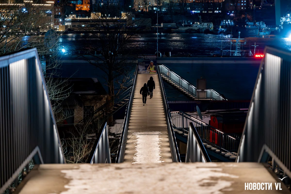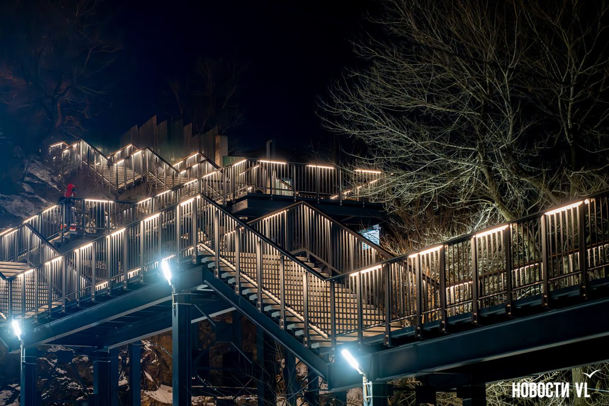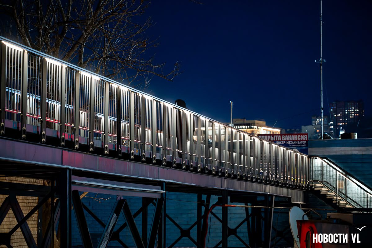 Во Владивостоке обновили один из самых длинных в городе виадуков надземный пешеходный переход от улицы Берёзовая к 42-му причалу. Вместо старой деревянной конструкции здесь теперь новый бетонный переход с архитектурной подсветкой и смотровой площадкой, с которой открывается красивый вид на Золотой Рог.