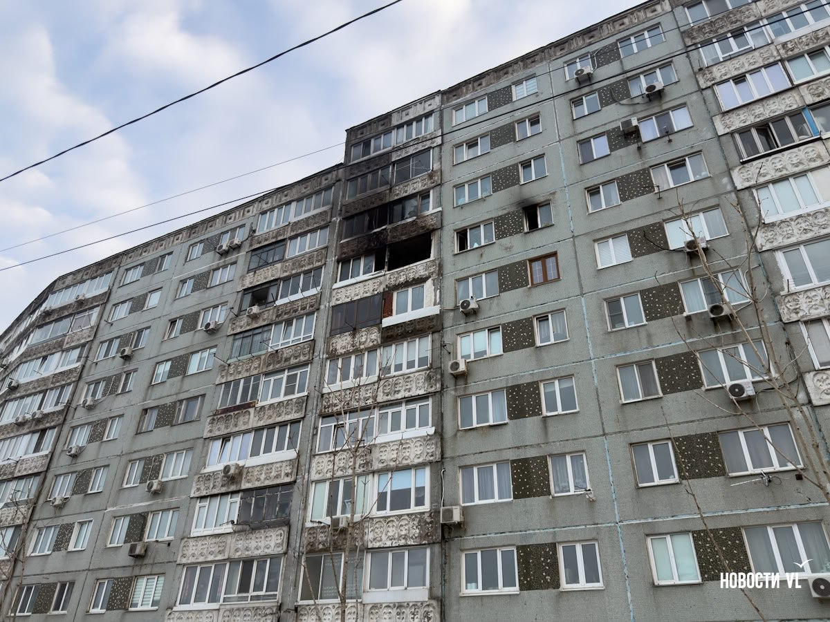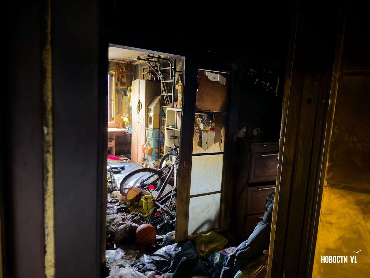 В подъезде следов тушения пожара практически нет. Но уже на 5 этаже ощущается запах гари. В квартире, где произошёл пожар, открыты дверь и окна. Внутри виднеются обгоревшая мебель и детские игрушки, а также стоящие в одной из комнат, видимо, детской, велосипеды. На лестничной клетке валяется маленькая плюшевая утка. Потолки покрылись сажей.