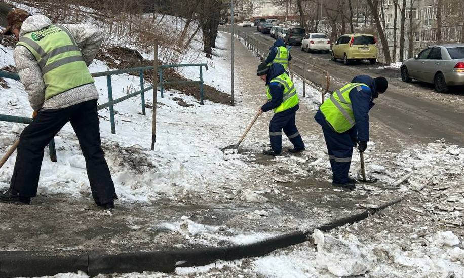 Специализированная бригада выполняет ручную уборку тротуаров от снега и льда на улице Пограничной.