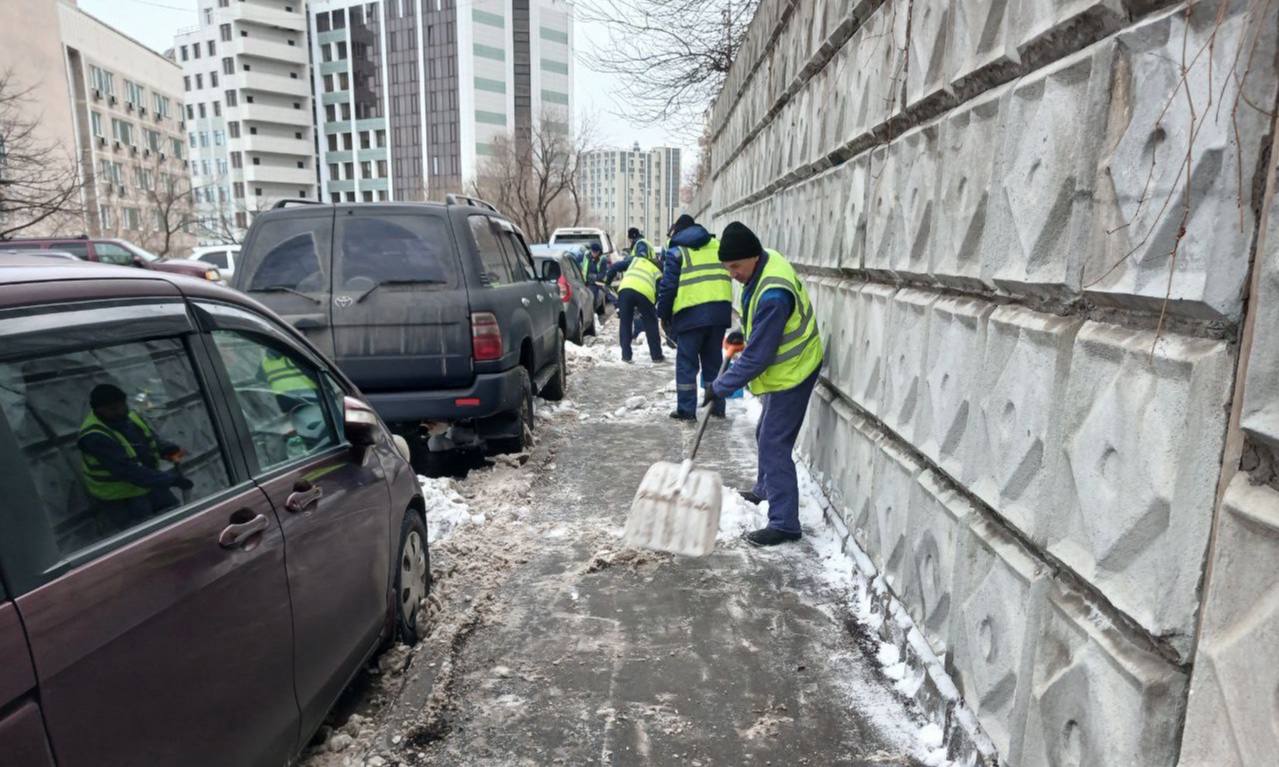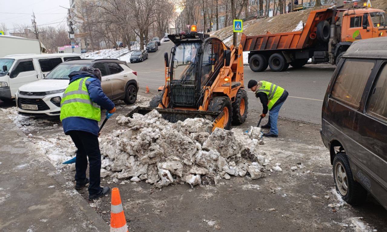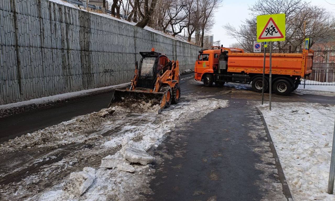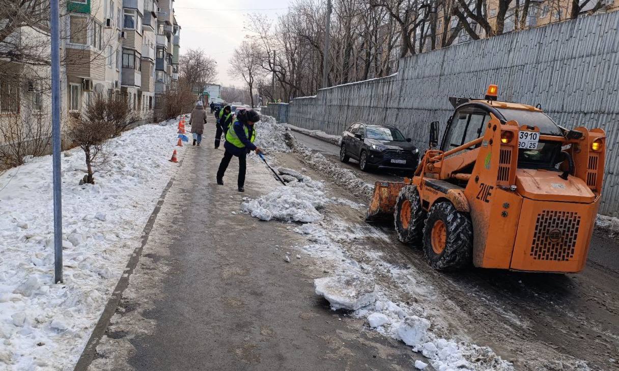 Первореченский район — ручная просыпка тротуаров на улицах Вострецова и Жигура, уборка тротуара на улице Сабанеева; комплексная уборка тротуара и проезжей части на участке Жигура — Паровозная.