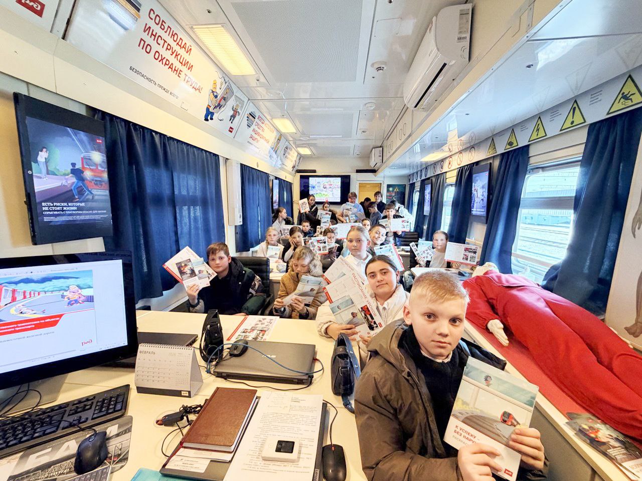 Также пригласили школьников в специальный вагон охраны труда, где прошел урок безопасности в комфортном учебном классе, оснащенном оборудованием для показа презентаций и видеороликов.