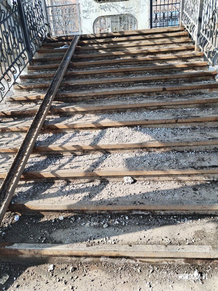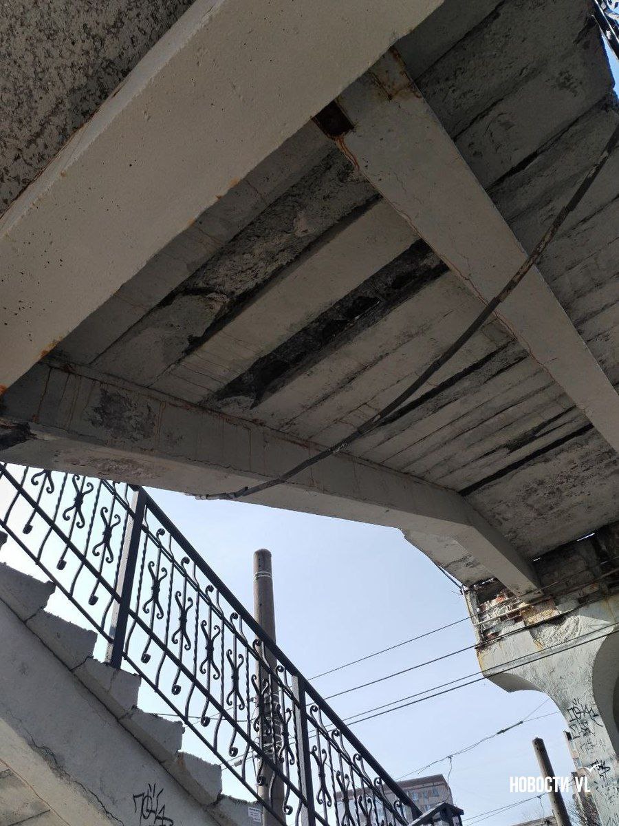 Виадук в районе остановки "Поликлиника" рядом с парком Минного городка осыпается на головы горожан. По словам очевидцев, куски бетона от верхнего пролёта падают на ступени нижнего. Граждане простят отремонтировать переход.