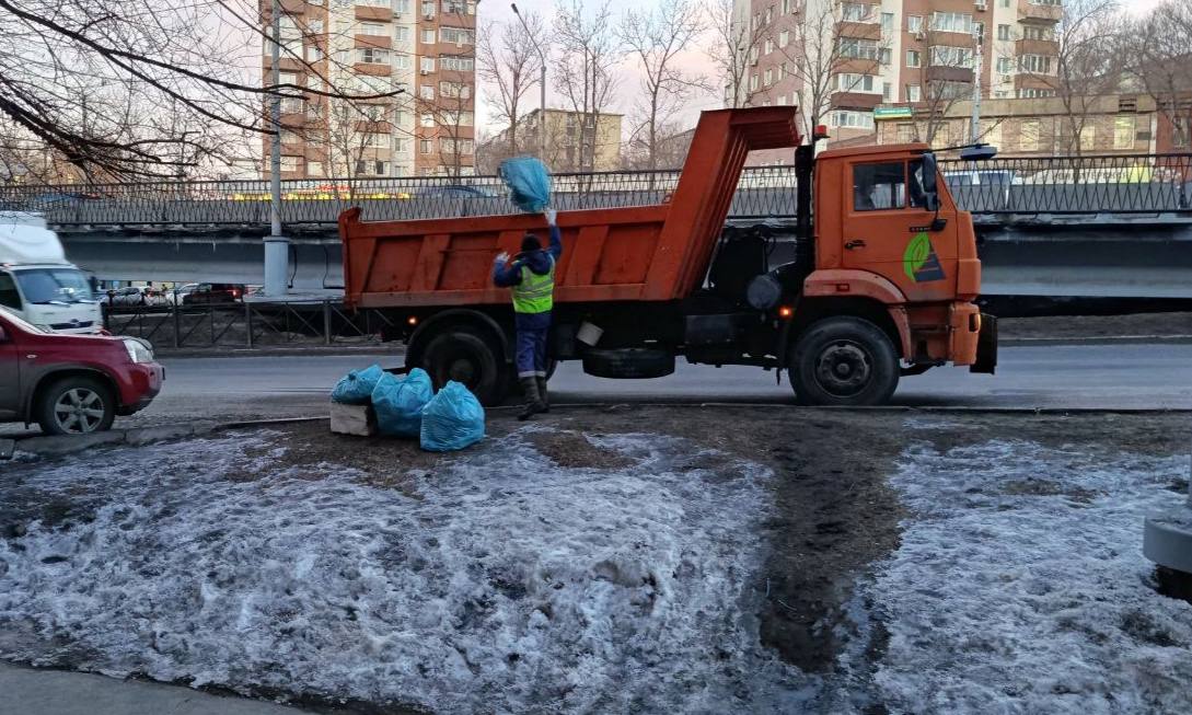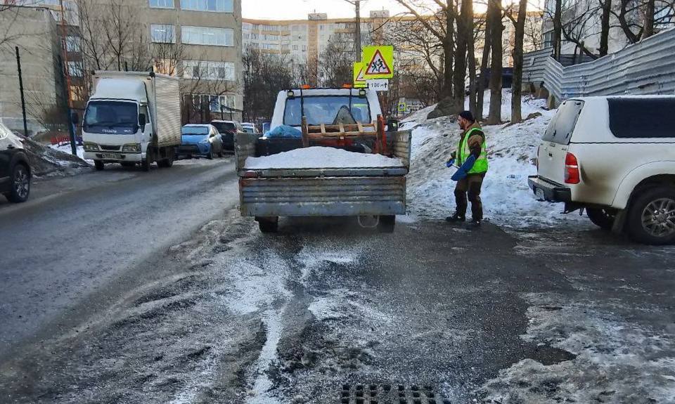 Фрунзенский район — ручная просыпка тротуаров на Океанском проспекте, вывоз автомобильных шин и удаление несанкционированной рекламы по району; вывоз свалки на улице Верхнепортовой и вывоз шин по району.