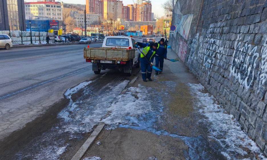 Специализированная бригада выполняет ручную уборку тротуаров от наледи на проспекте 100-летия Владивостока, 159а–г.