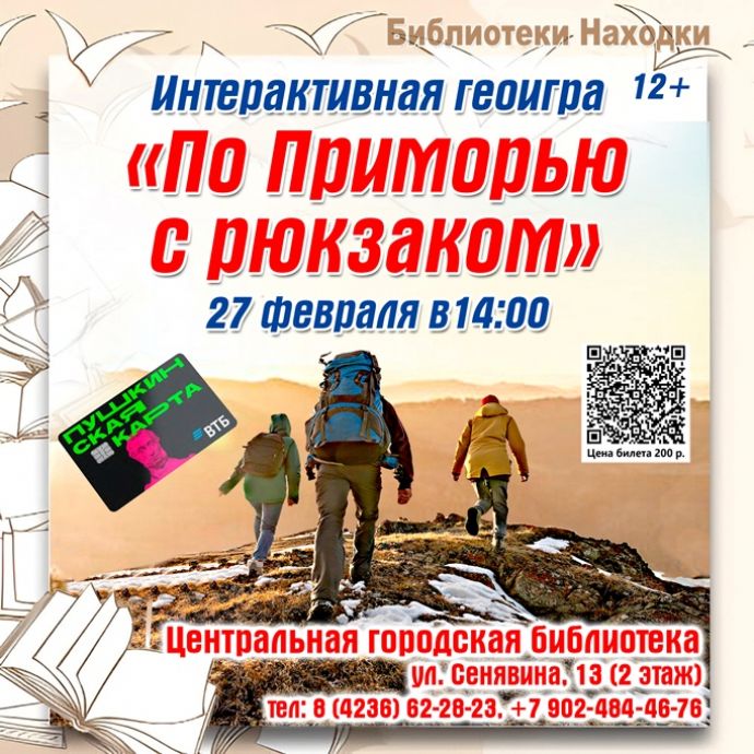 Центральная городская библиотека Находки (Сенявина, 13) 27 февраля превратится в стартовую площадку для увлекательной краеведческой игры «По Приморью с рюкзаком». Участникам мероприятия предстоит перемещаться по заданному маршруту внутри стен учреждения, погружаясь в мир природных красот, исторических мест и культурных объектов родного региона. Начало в 14:00.