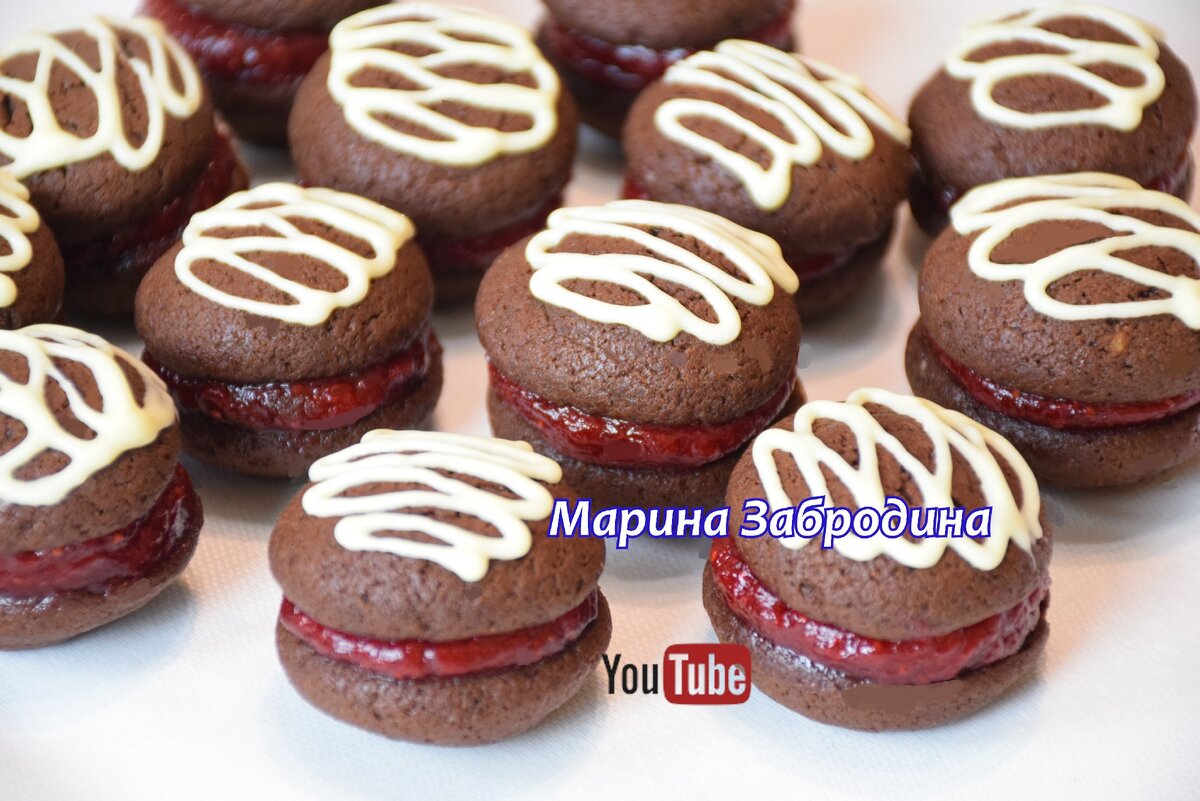 После выпечки начинить пирожные клубничной смесью и накрыть второй половинкой теста, затем украсить растопленным белым шоколадом.