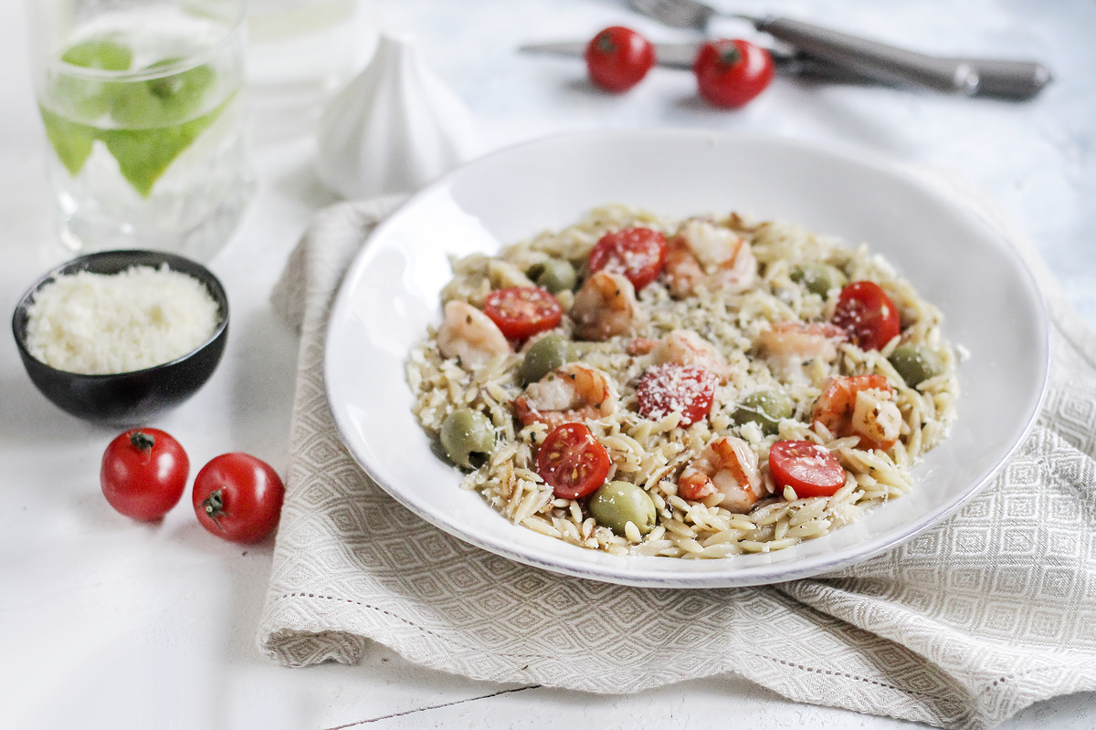Шаг 2: По желанию, удалите хвостики с креветок. На другой сковороде с 1 ст. ложкой масла обжарьте креветки по 20 секунд с каждой стороны на сильном огне. После приготовления сбрызните их лимонным соком. Помидоры черри разрежьте пополам. Смешайте орзо с креветками, черри и оливками. Подавайте блюдо немедленно, разложив по тарелкам и посыпав тертым пармезаном.