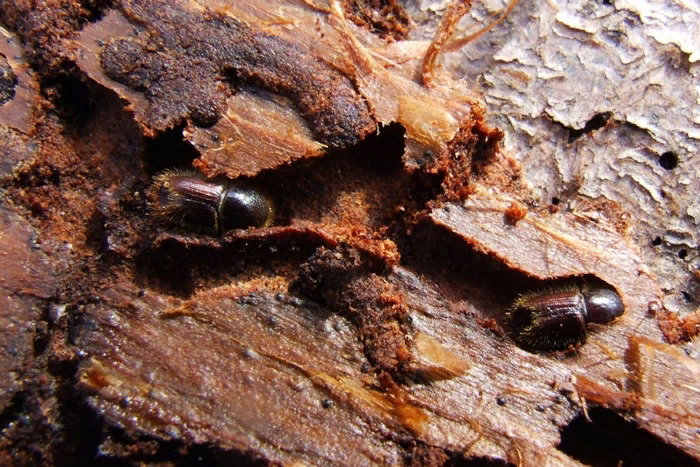1. Короед-типограф. Этот жук находит свою пищу в ароматных еловых лесах, возраст которых превышает 60 лет. Характерный для типичных вредителей, он предпочитает ослабленные деревья, но при массовом размножении не пренебрегает и здоровыми. Нанеся повреждения дереву, короед создает массу тоннелей, которые по ширине схожи с телом самого жука.