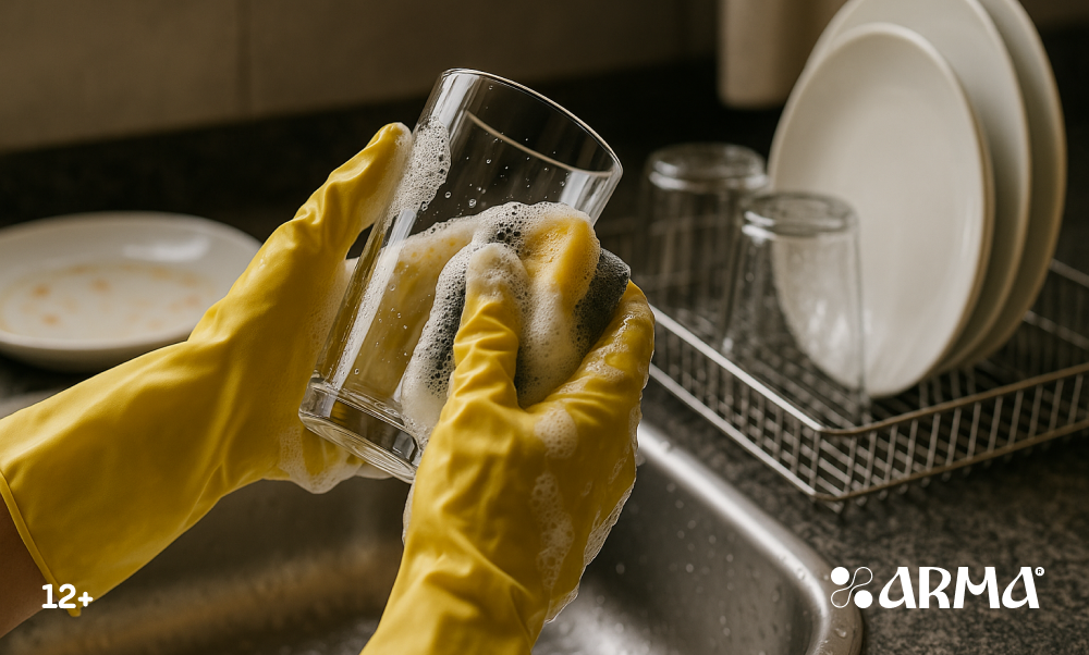 - Моющее средство. Используйте средство для ручного мытья посуды, которое эффективно растворяет жир, обеспечивая безопасность для рук. Например, средство от бренда «Арма» отлично подойдет тем, кто заботится о своем здоровье и экологии.