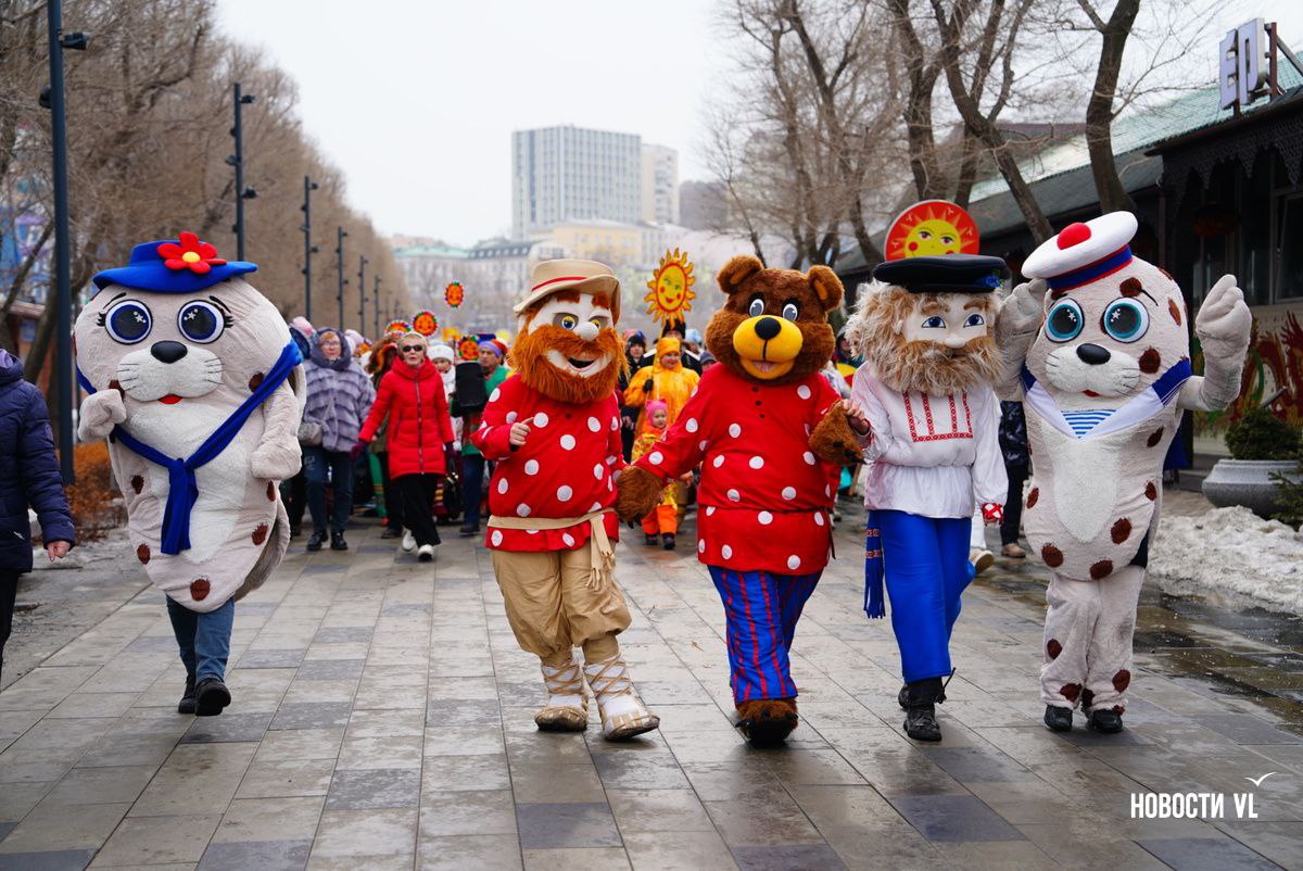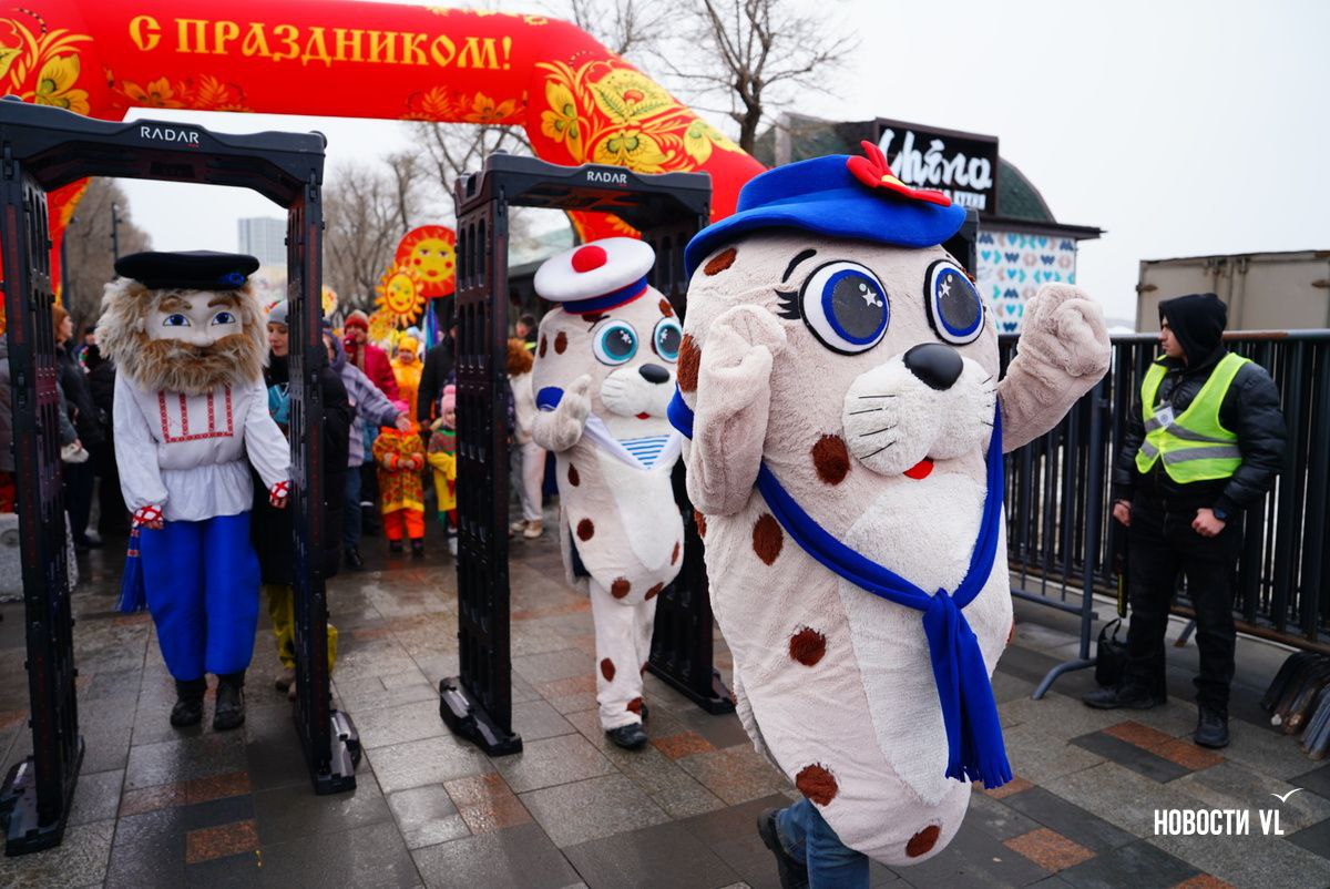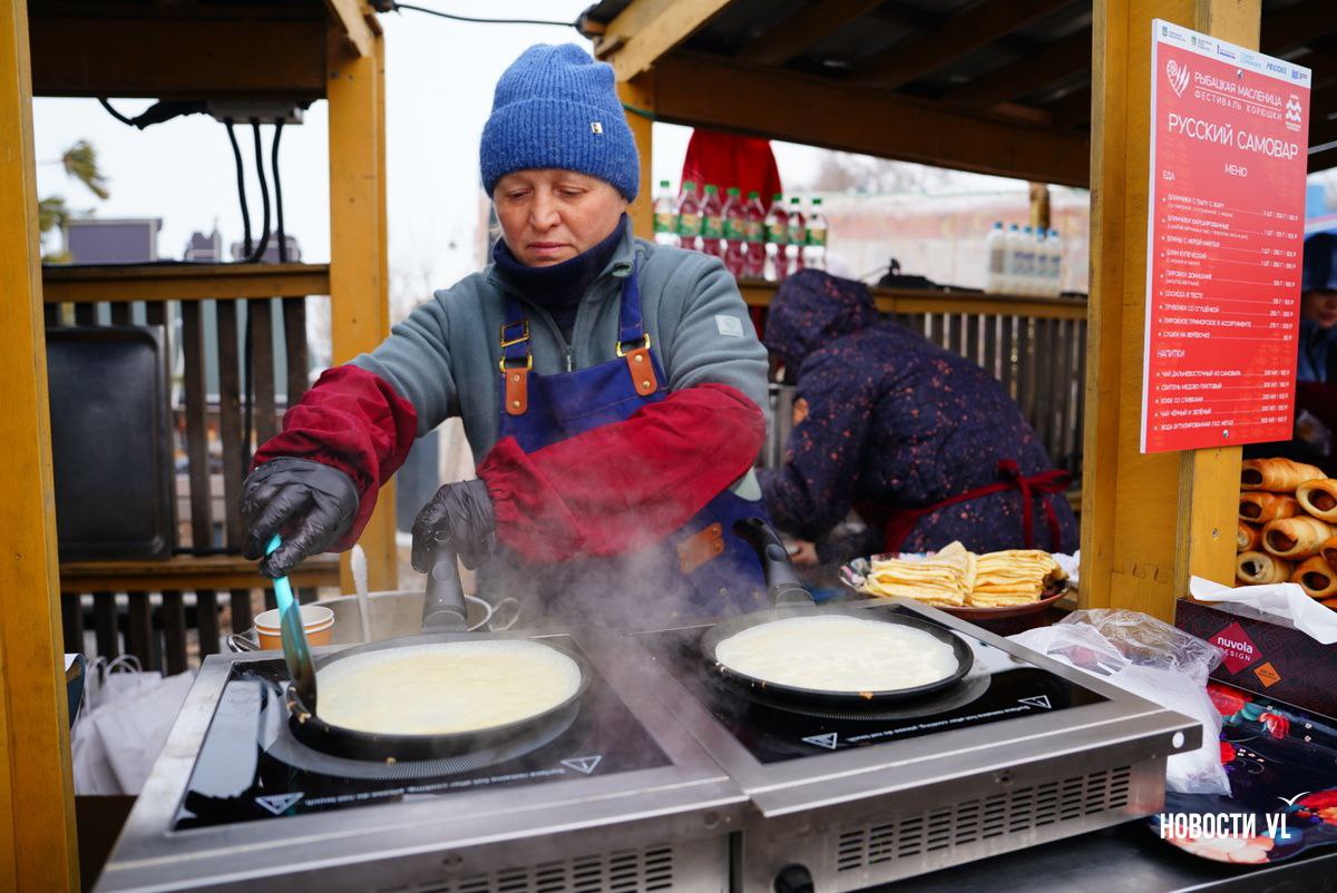 Возле наццентра расположилась одна из локаций и уже выстроилась самая длинная очередь – горожане стоят, чтобы попробовать жареную корюшку, приготовленную владивостокскими поварами. А на отремонтированной набережной на Батарейной горожане танцуют и поют у сцены, фотографируются в тематических зонах, стреляют из лука, достают подарки с масленичного столба и выстраиваются у лавок с едой от местных заведений – блины можно отведать в среднем за 150-200 рублей.