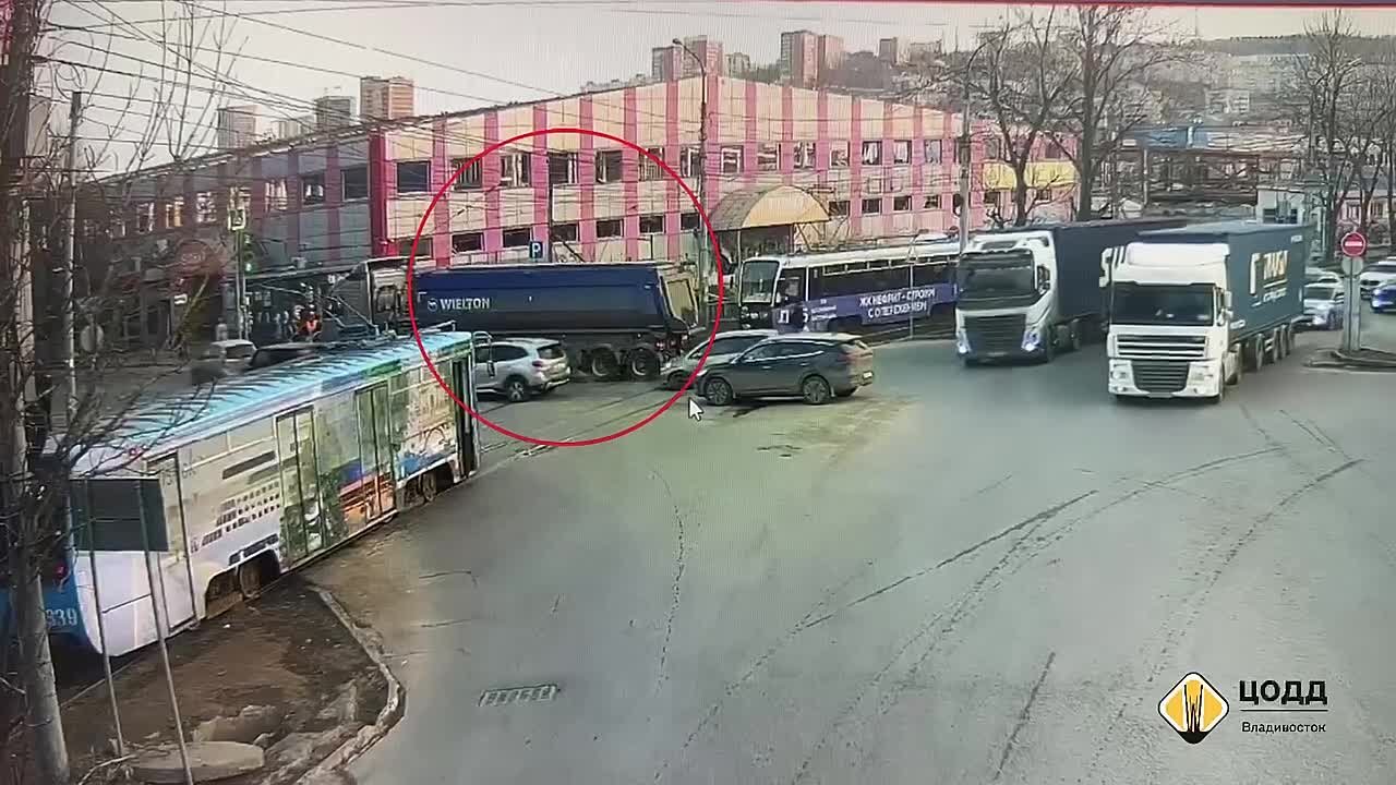Авария произошла на перекрестке улиц Спортивной и Фадеева. Участники – легковой автомобиль и большегруз – стоят на рельсах.