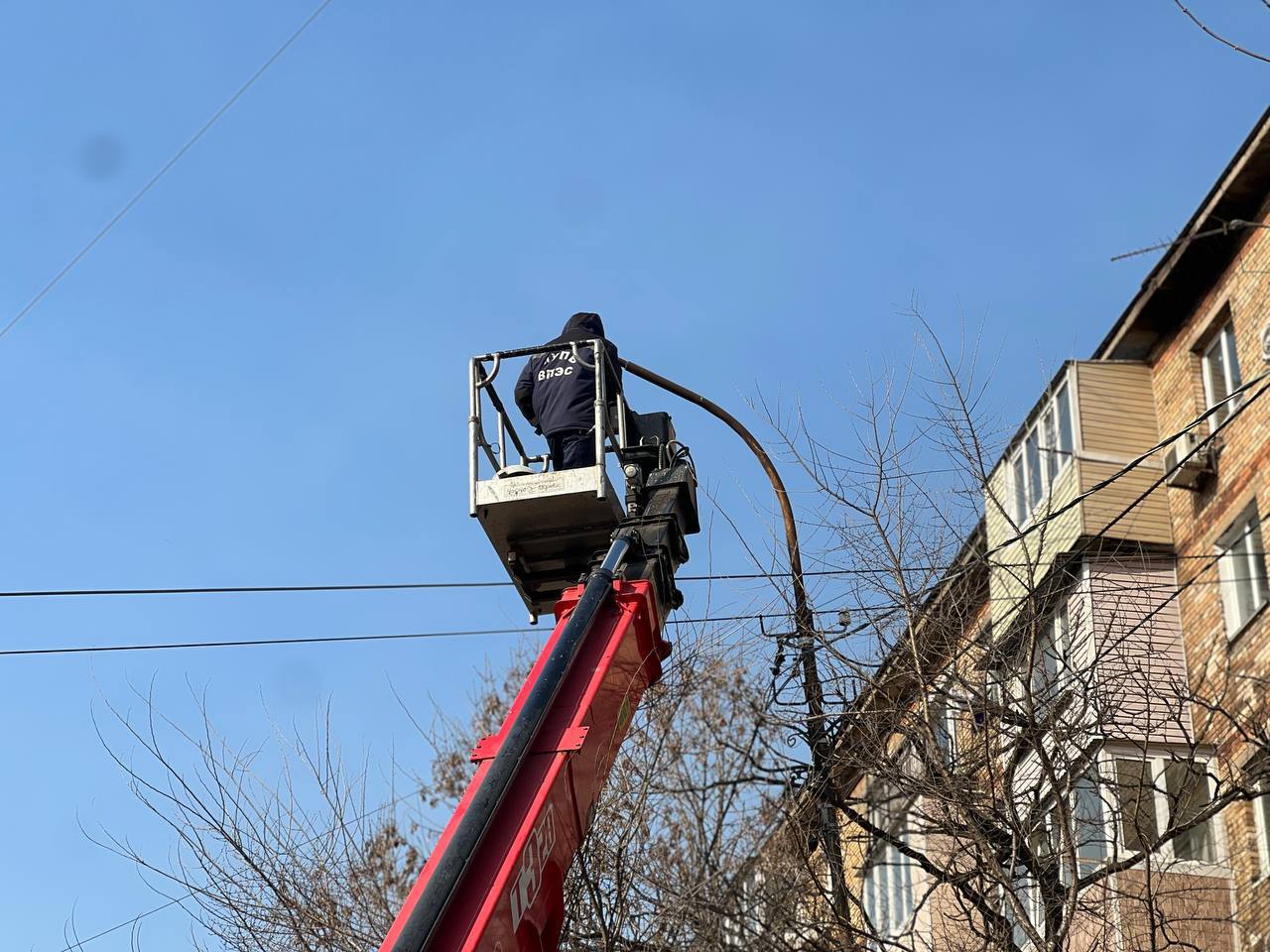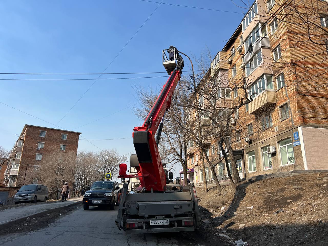 Специалисты «Владсвет» меняют фонари в районе улицы Адмирала Юмашева.