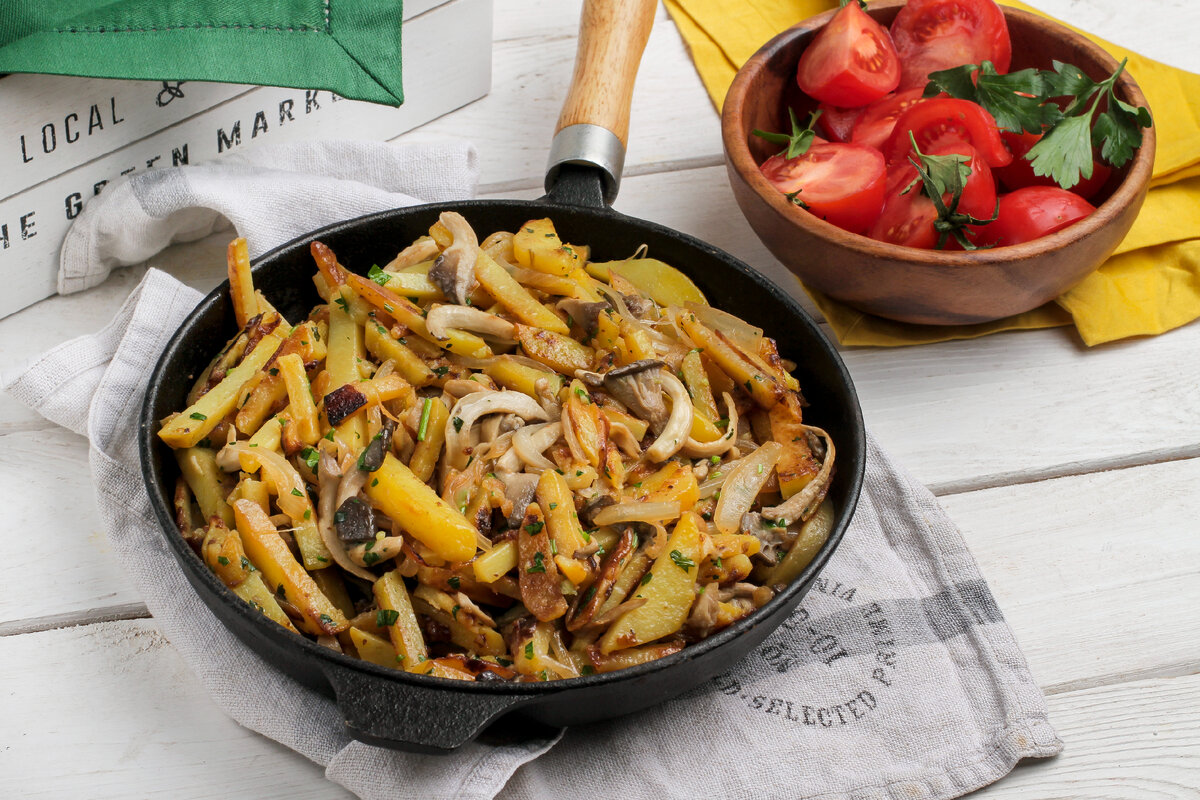 Картофель является настоящим героем на кухне. Его мягкий вкус позволяет создавать разнообразные кулинарные шедевры. В нынешнем рецепте акцент сделан на белых грибах, вёшенках и сочных помидорах. Они великолепно дополняют нежный картофель, придавая блюду насыщенный аромат и необычайную текстуру.