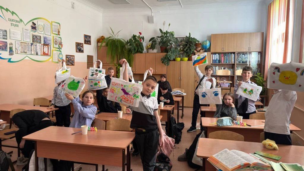 Ученикам младших классов рассказывают о вреде пластиковых пакетов, а также о способах сокращения их числа в повседневной жизни. Помимо этого, детям дарят экологические сумки, которые ребята раскрашивают в течение урока.