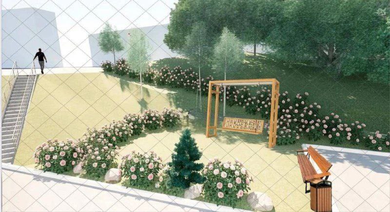 Идея заключается в создании пространства с качелями, лавочками, урнами и озеленением.
